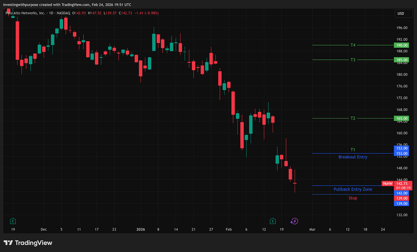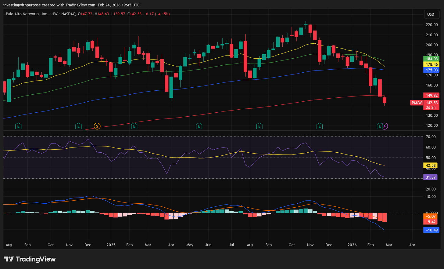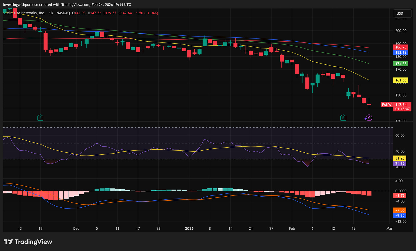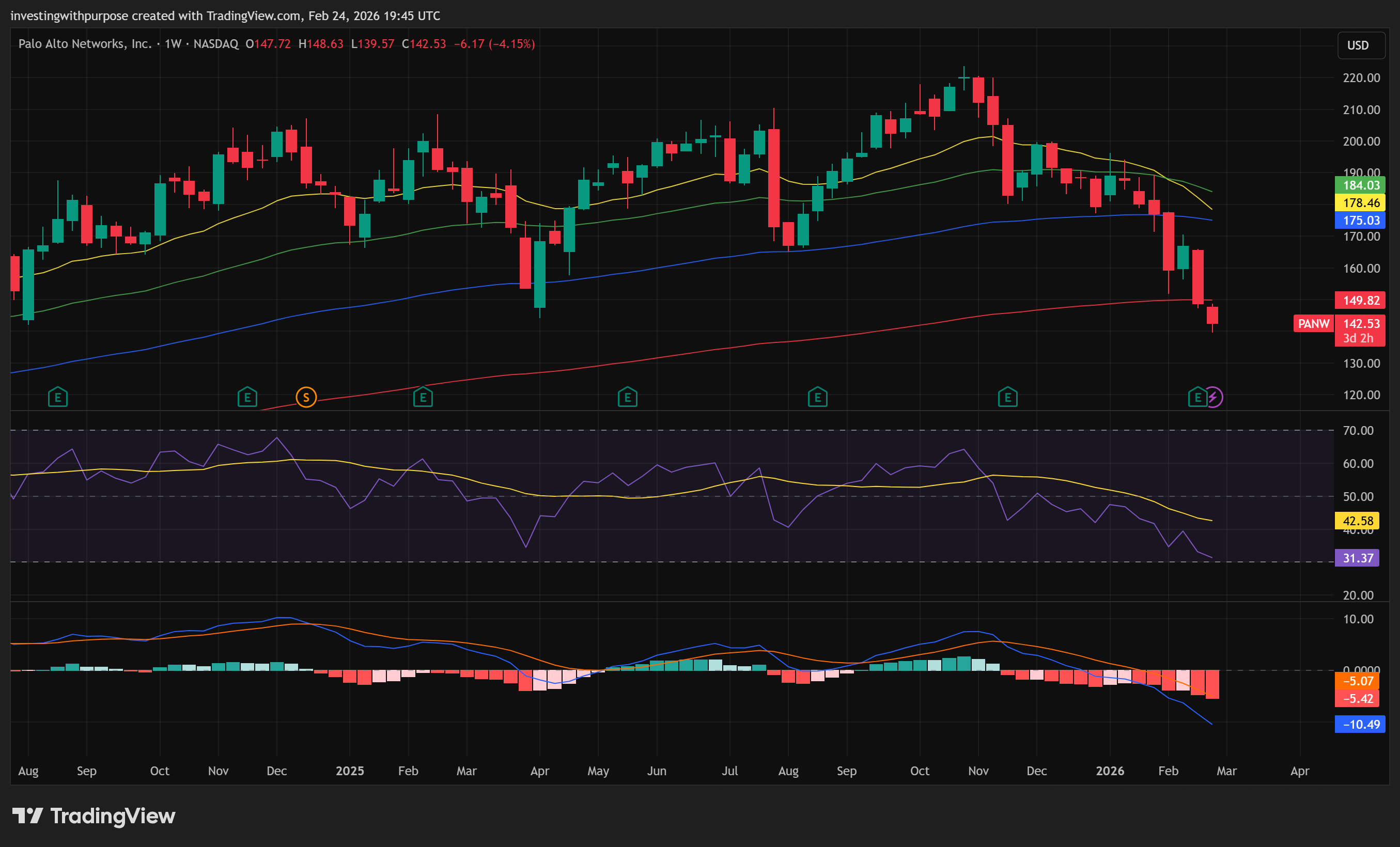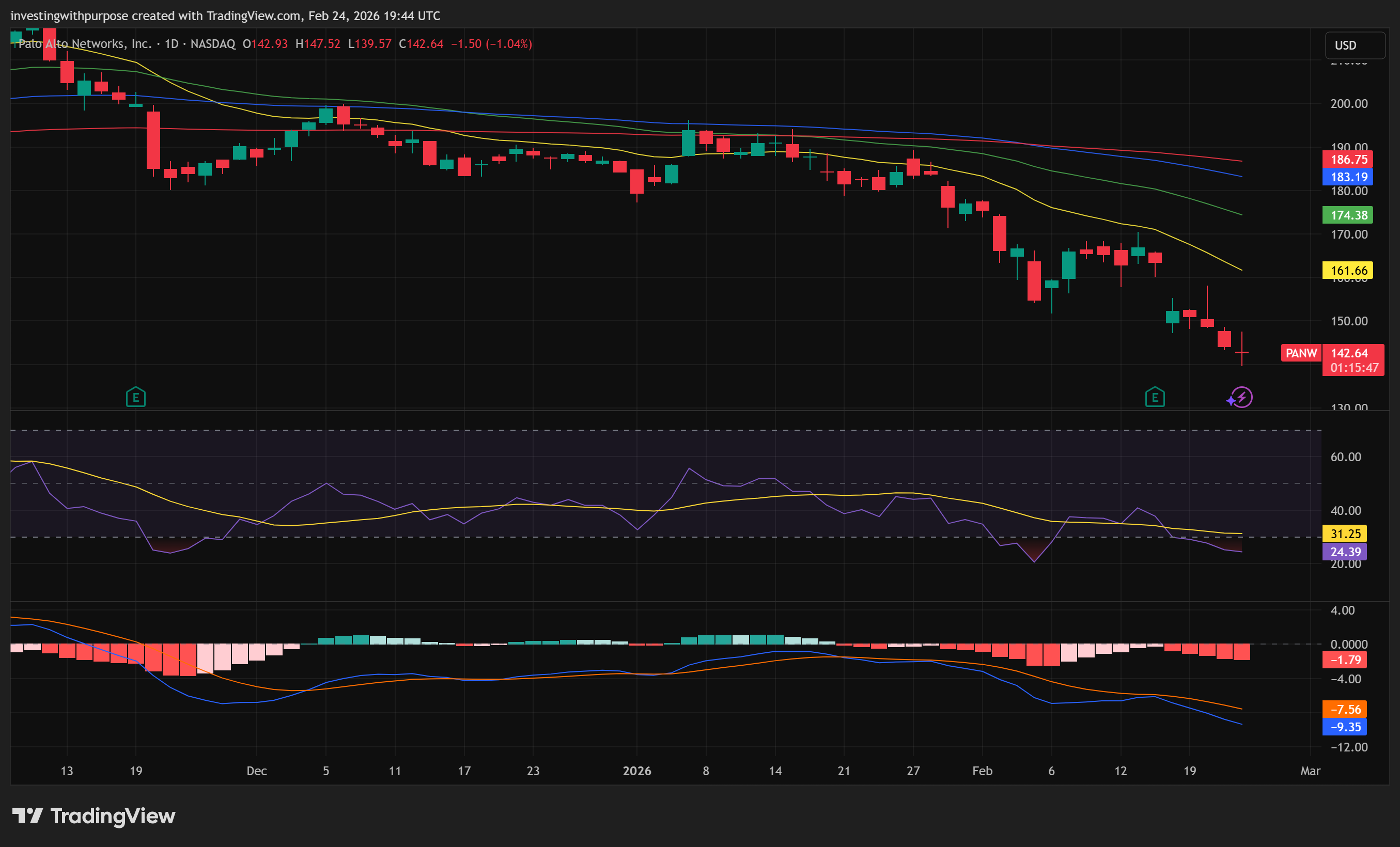 Then February earnings hit, and the stock gapped down 7% overnight and has not stopped falling since. At $142, PANW sits 37% below its 52-week high. That kind of decline in a quality company is rarely pure noise, but it is rarely the end of the story either.