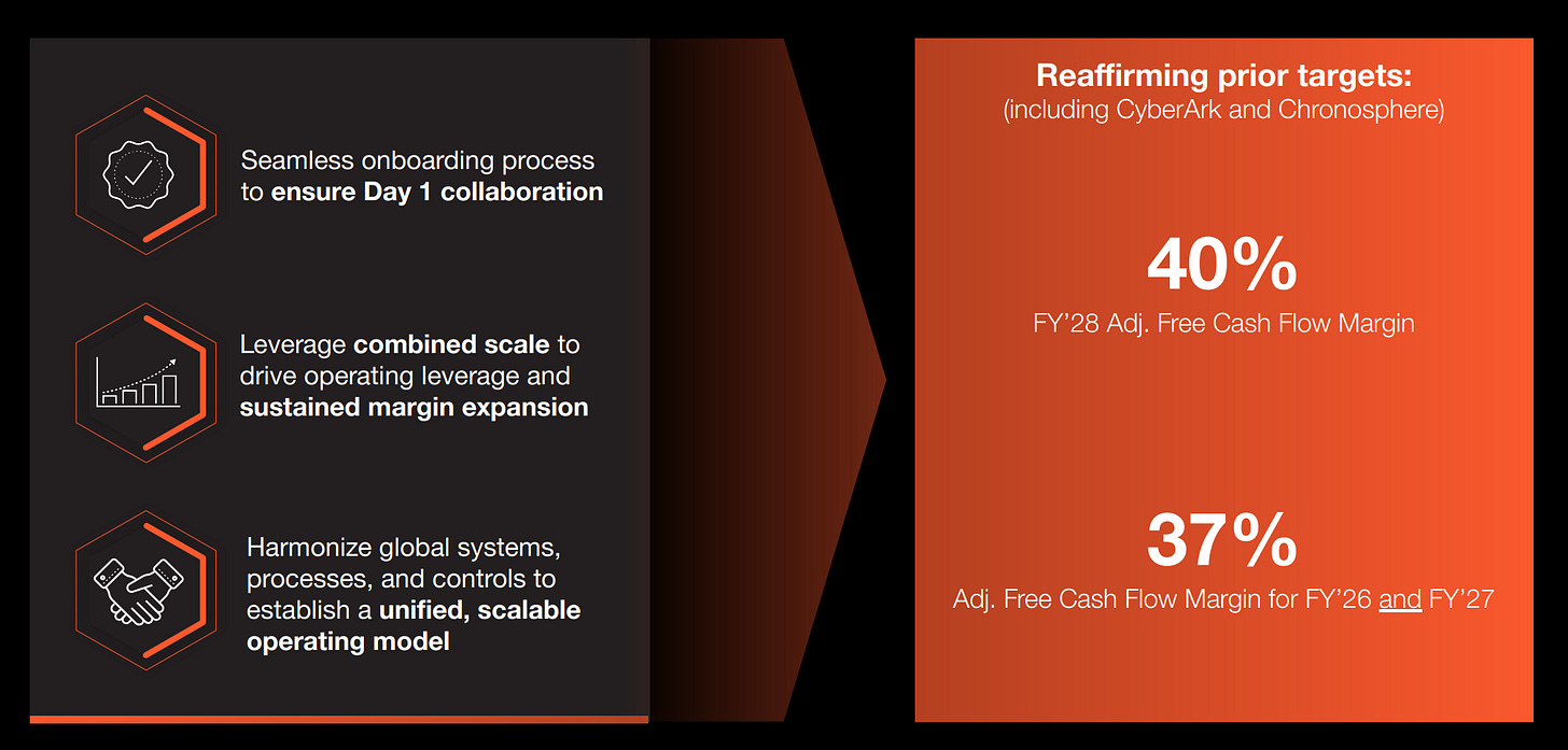 None of that changed at earnings. What changed was the profit timeline. Two large acquisitions closed in quick succession: CyberArk, a $25 billion identity security deal, and Chronosphere, a $3.35 billion observability platform. Both bring immediate integration costs, amortization charges on acquired intangibles, and dilution from newly issued shares. Full-year revenue guidance went up. Profit per share guidance came down.