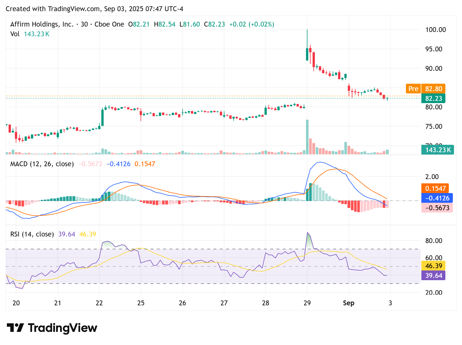 AFRM 0.00%↑ ’s surge past $100 already priced in much of the good news. Its pullback into the $80s suggests momentum has cooled, and the charts point toward a period of digestion before the next big leg higher.