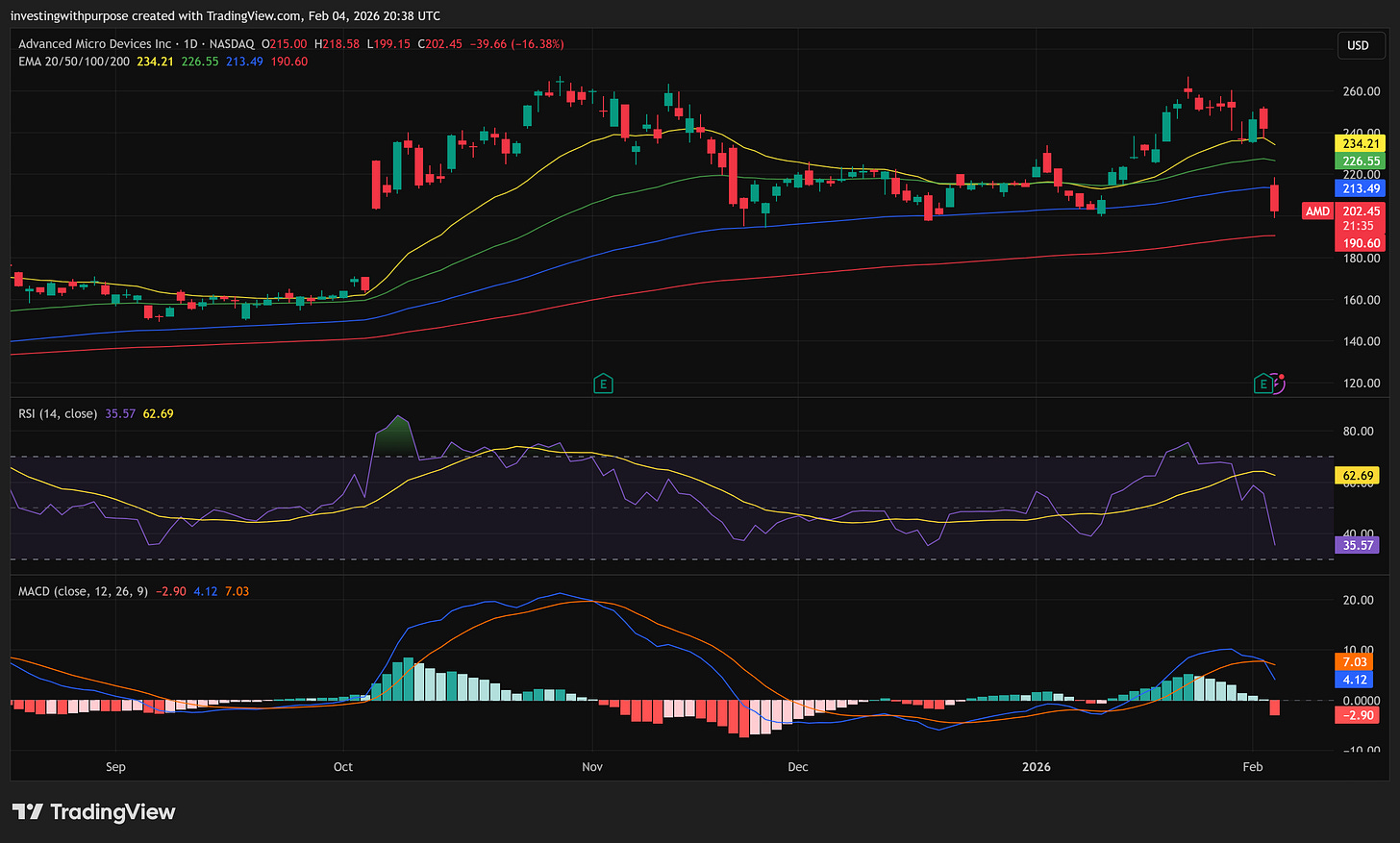 Advanced Micro Devices just went through a sharp repricing. Not a slow drift lower. Not a quiet consolidation. A fast, emotional reset that forced investors to reassess expectations in real time.