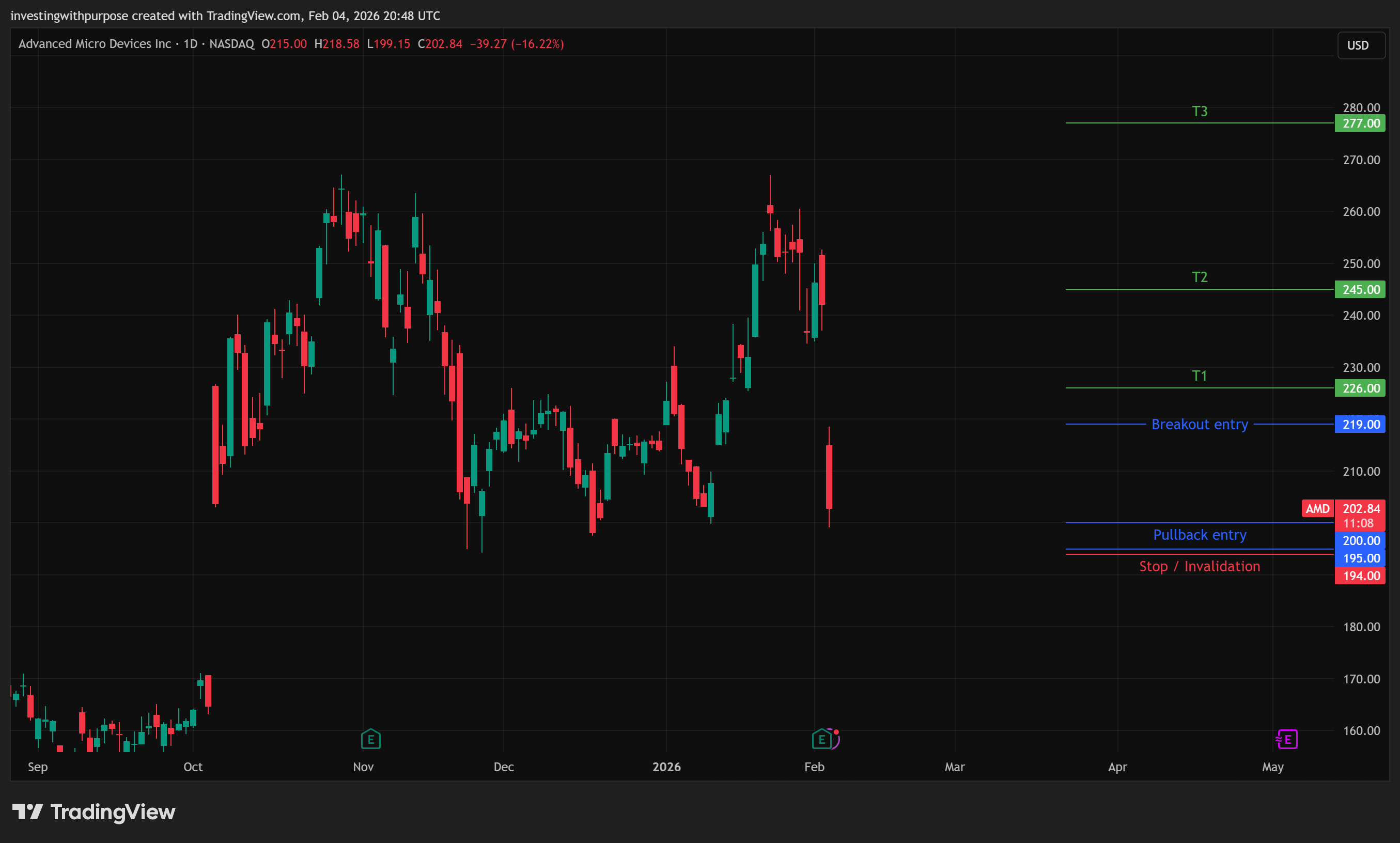 AMD is not a buy-and-chase stock here. It becomes attractive only with confirmation or deeper pullbacks.