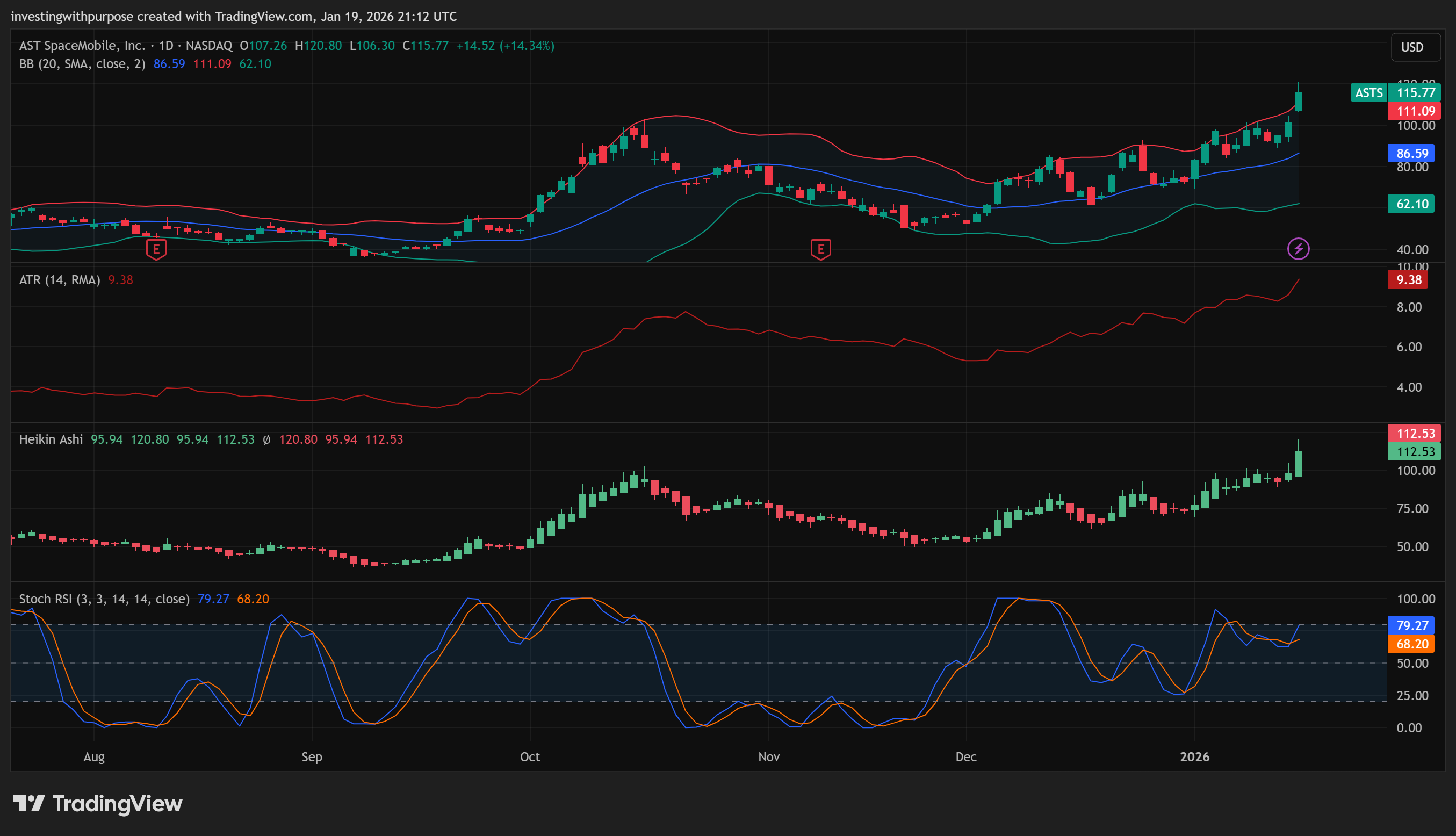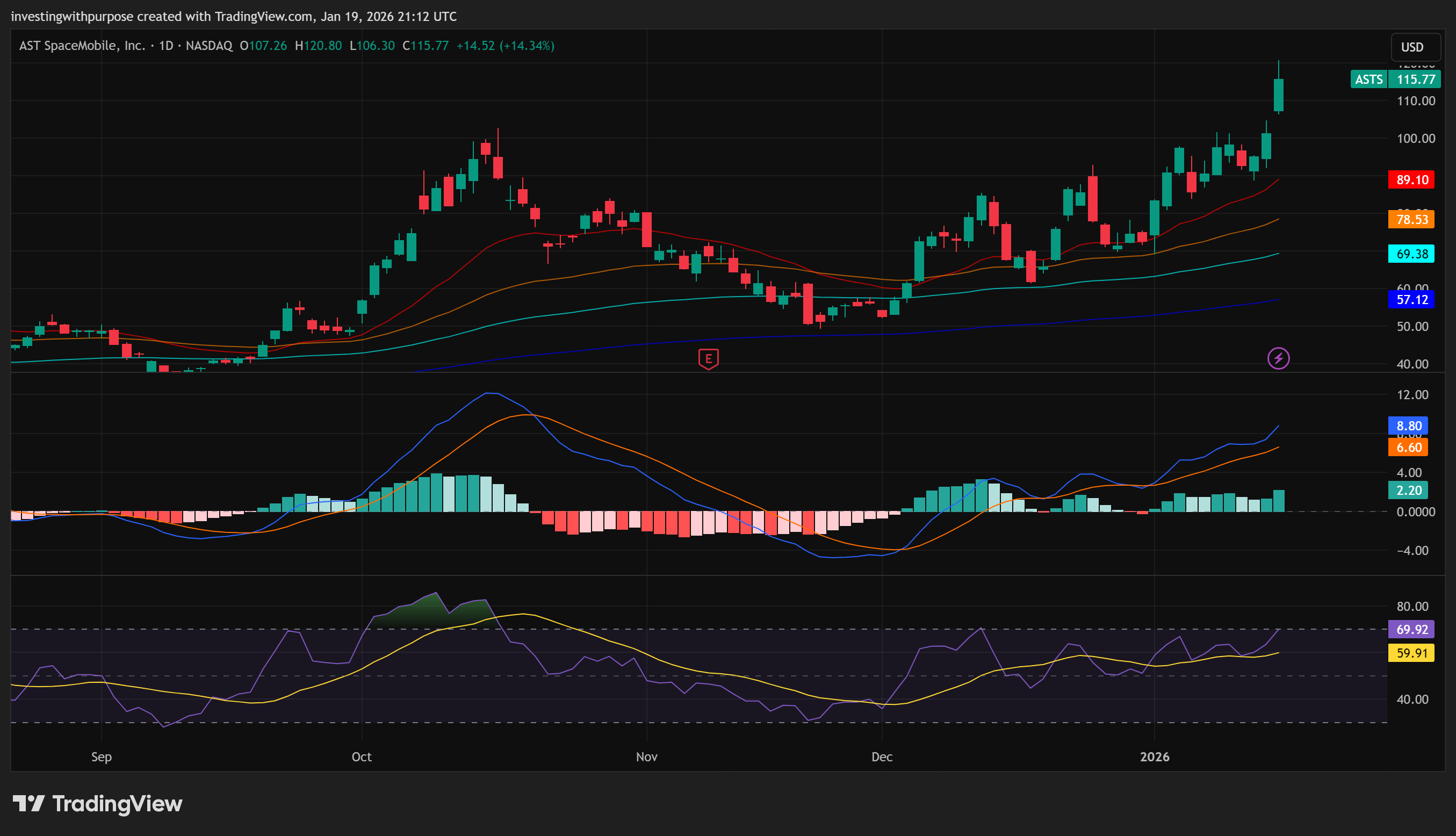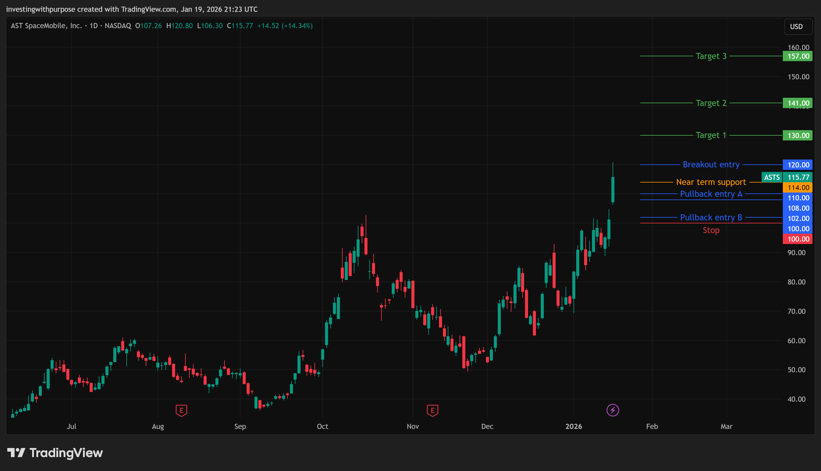 Our December ASTS thesis played out almost level by level. Support held, the breakout above 82 confirmed, and price ran through 95, 110, and into the 115 to 120 zone.
