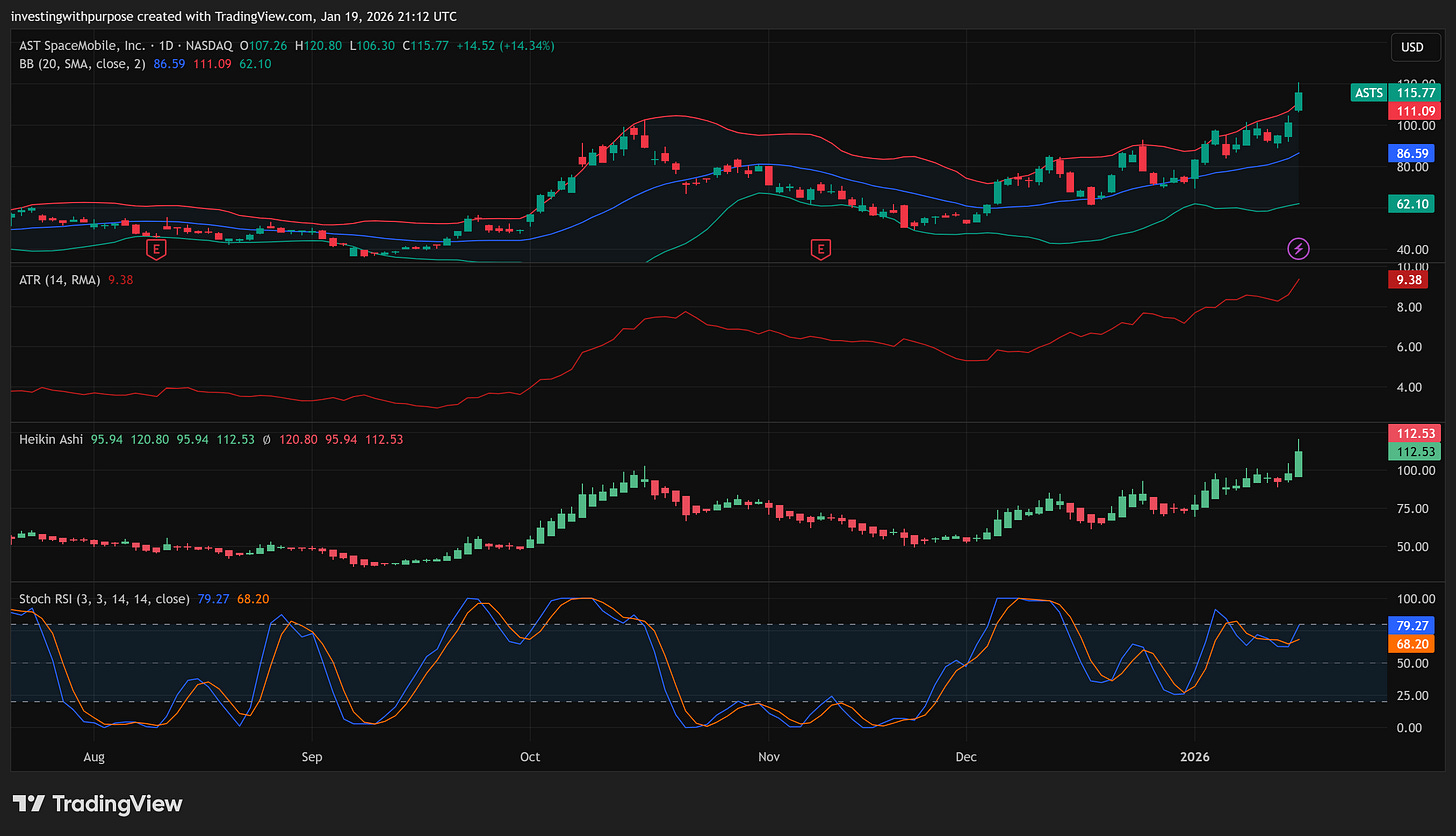 Second, price is stretched short term. ASTS is currently trading above its daily and weekly volatility bands and has tagged major measured move targets around 116 to 120. That does not mean the move is over. It does mean upside from here is no longer easy or low-risk.