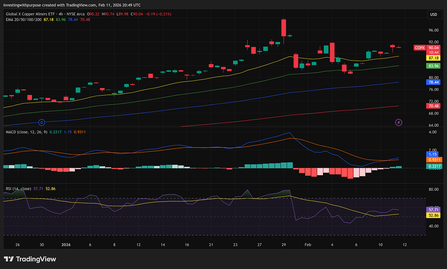 Technically, COPX is consolidating between 83.5 and 93 inside a larger uptrend.