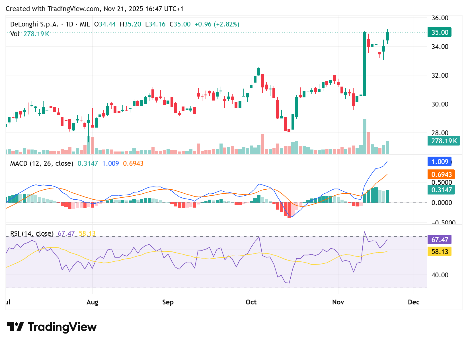 De’Longhi S.p.A. ($DLG, Milan) is a global leader in coffee machines and premium small appliances, with brands spanning De’Longhi, Braun and Kenwood. The stock has just broken to new highs after another “beat-and-raise” quarter and upgraded 2025 guidance, with Q3 revenues up and adjusted EBITDA margin at 17.0%.