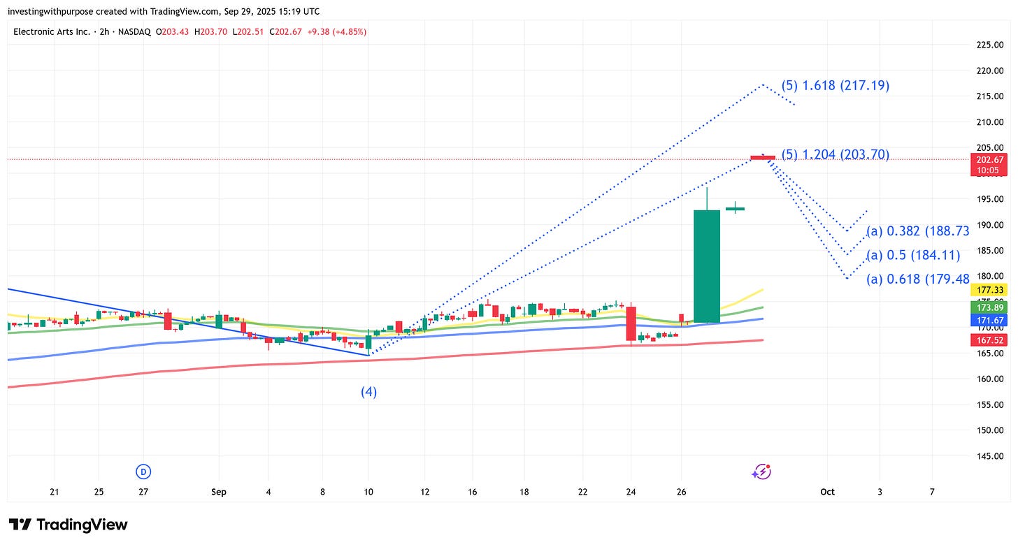 The buyout announcement triggered a vertical breakout in EA 0.00%↑’s price action, sending shares from the $170s to over $193 in a single session. They’re now in low $200s. That thrust has pushed RSI readings deep into overbought territory across multiple timeframes and left an unfilled gap below $185.