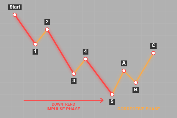 In a bear market, the 5-wave impulse is down, and the 3-wave correction is up.