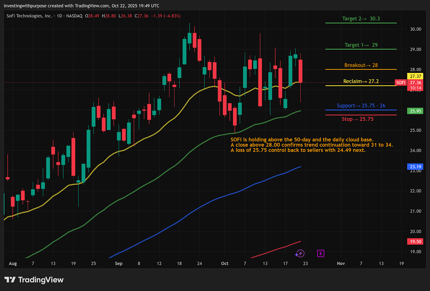 SOFI: Buy the hold above 28 with strength. Stop 26.0 to 25.7 depending on risk tolerance. Targets 31 then 34. If 25.75 fails, wait lower at 24.5 support.