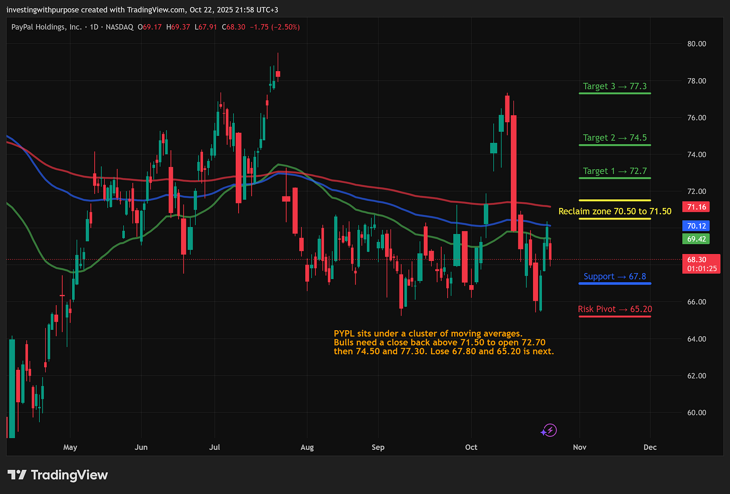 PYPL: Accumulate only on daily close above 71.5. Initial stop 69.1. First target 74.5, second 77.3. If 67.8 breaks, step aside and reassess near 65.2.