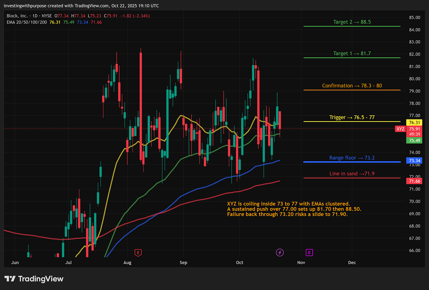 XYZ is coiling at support with improving profitability. A clean break above the high-70s can trend.