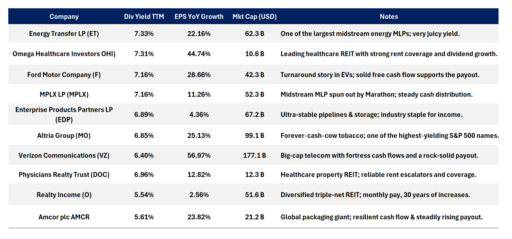 By combining above-average yields with solid earnings momentum and balance-sheet resilience, these ten names strike a balance between income and security. They represent a cross-section of industries, energy infrastructure, healthcare real estate, telecom, consumer staples and more, so you can diversify your income sources. As always, do your own due diligence on payout ratios, sector outlooks and valuation before pulling the trigger.