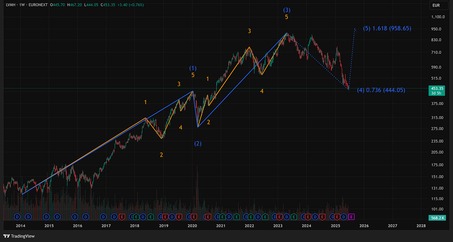 Wave 4 base carved at €444–455 on weekly Elliott + RSI/MACD divergence.