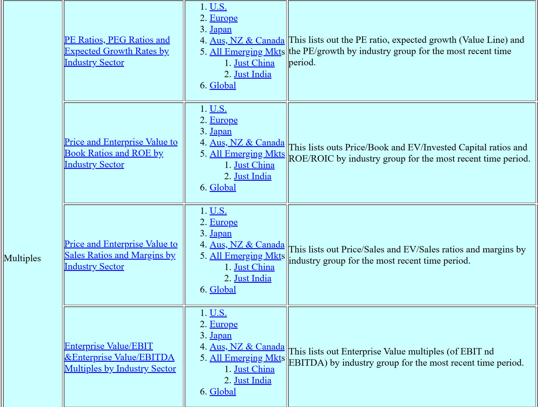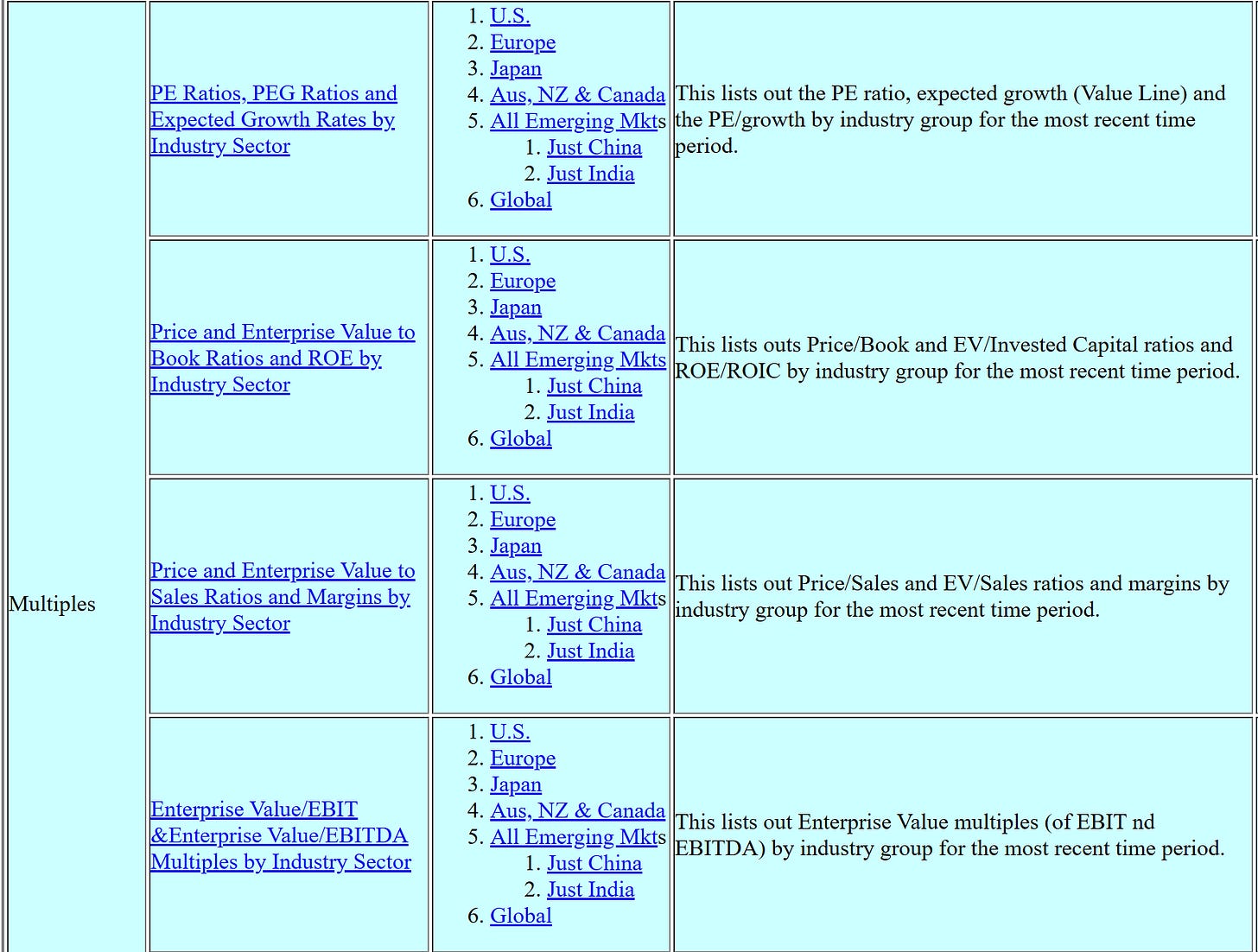 For investors looking for credible, up-to-date data on valuation multiples, few resources match the quality and breadth of Aswath Damodaran’s NYU Stern website. Damodaran, often called the “Dean of Valuation,” publishes annual datasets that cover market-wide valuation multiples across sectors and geographies.
