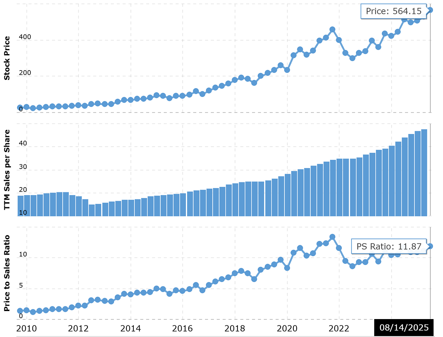 Late Bull Markets: High ratios feel “normal” because everyone expects growth to continue. Tech companies in 1999 traded at P/S ratios above 20 without raising eyebrows.