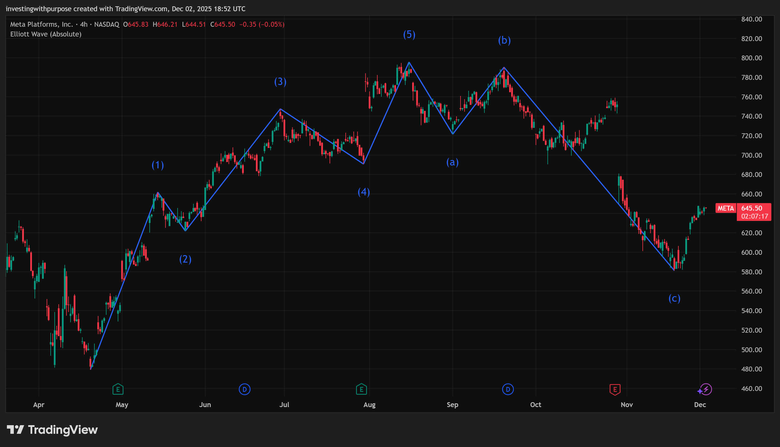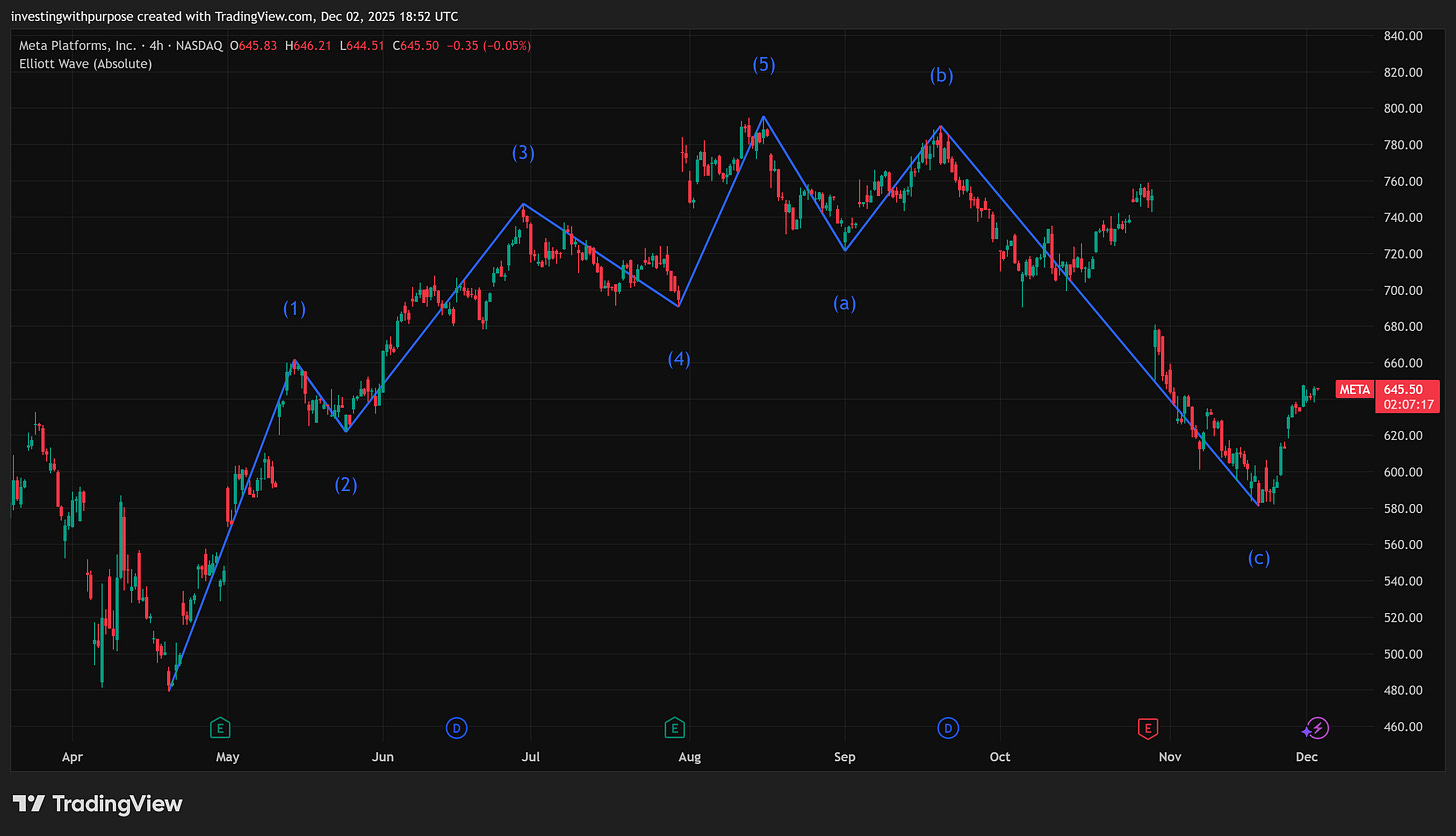 On the longer timeframe, Meta has already put in a big, clean advance from the 2023 lows into the 790 to 800 area in 2025. That run looks like a textbook five-wave impulse in Elliott terms.
