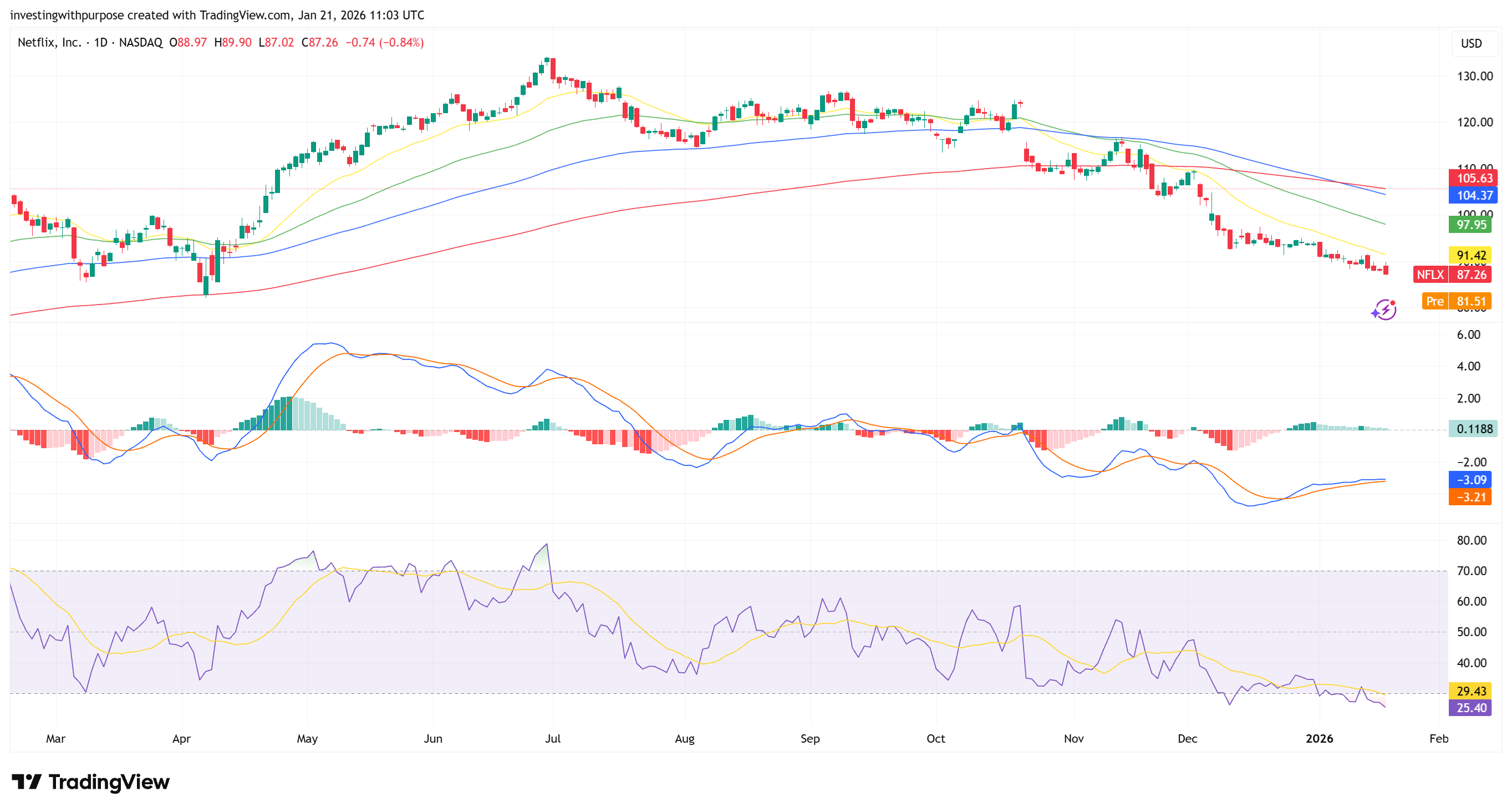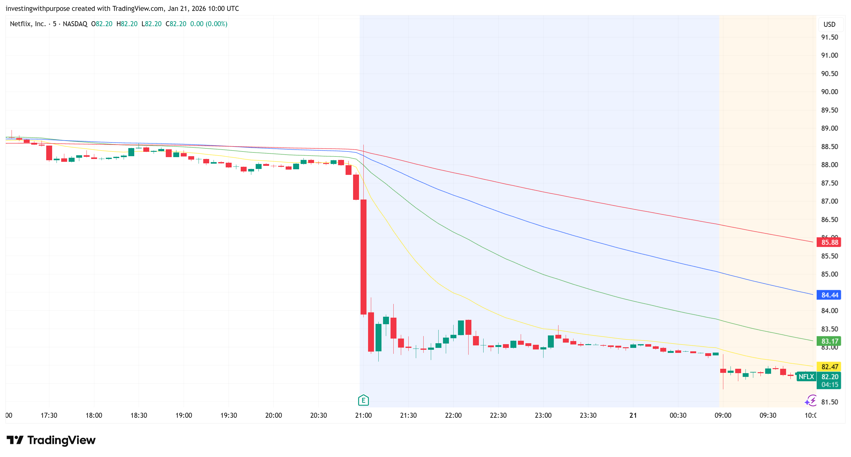 The market accepted lower prices after earnings. As long as Netflix, Inc. stays below the 1H EMA 50–100 (~$85–$88), any upside is only a tactical bounce, not a trend reversal.