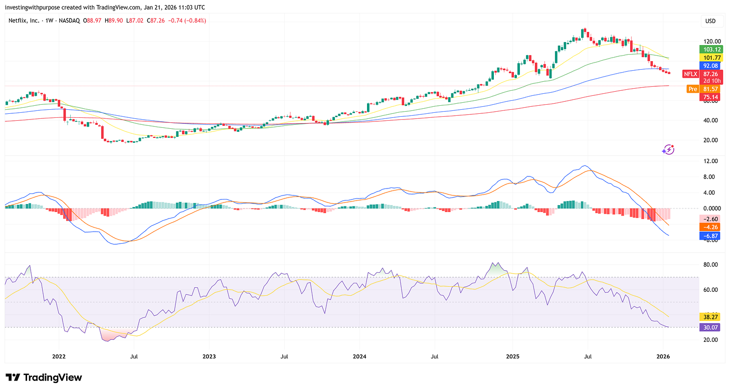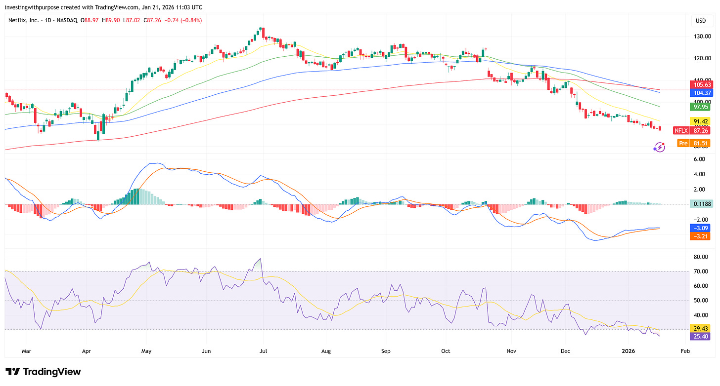 The pullback reflects a transition point for the stock. Netflix is evolving from a high-multiple growth compounder into a capital-intensive media platform with meaningful leverage, acquisition risk, and integration execution ahead. The market is now recalibrating what multiple it is willing to pay for that profile, even as underlying fundamentals remain strong.