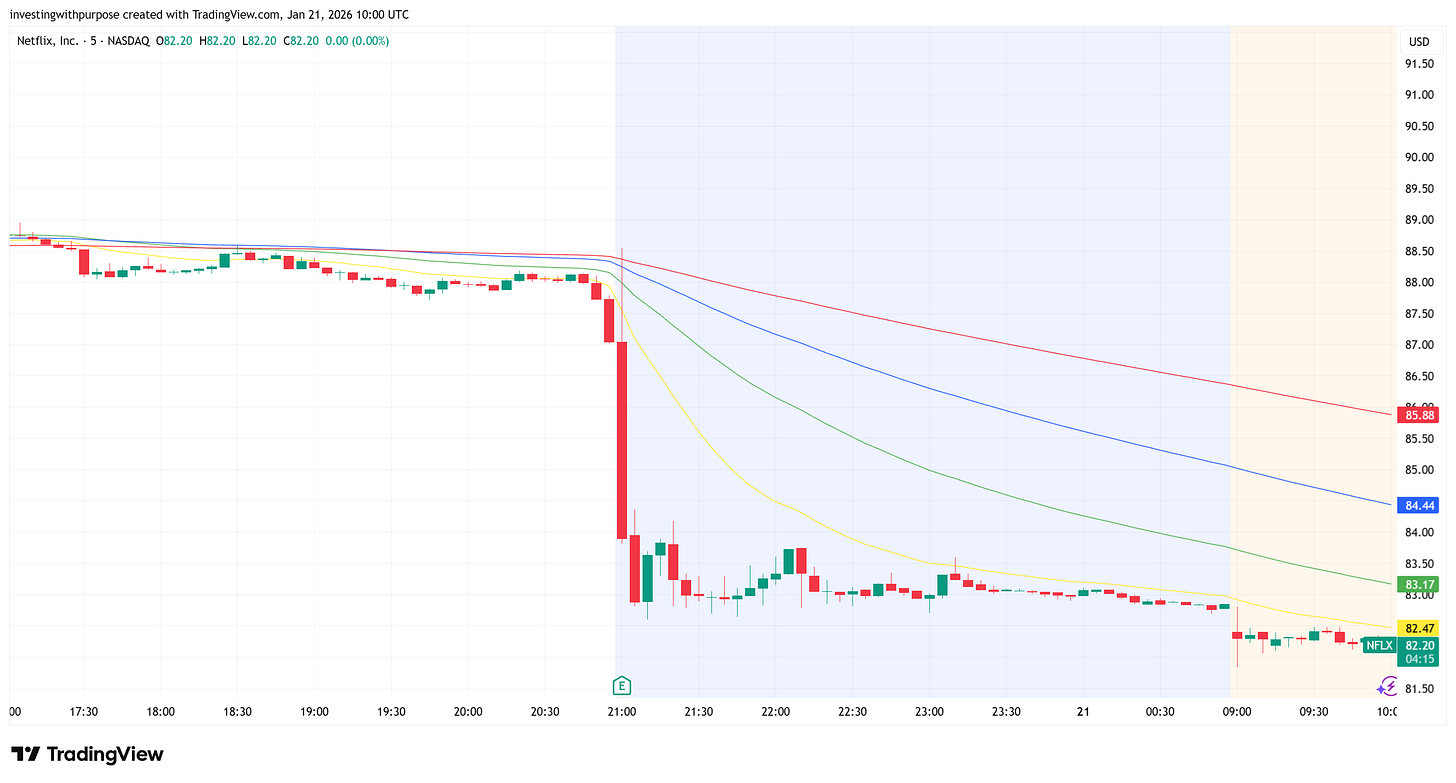 Daily structure is cleaner: NFLX 0.00%↑ has been walking down and then broke hard post-earnings. The selloff shoved price below the all daily moving average.