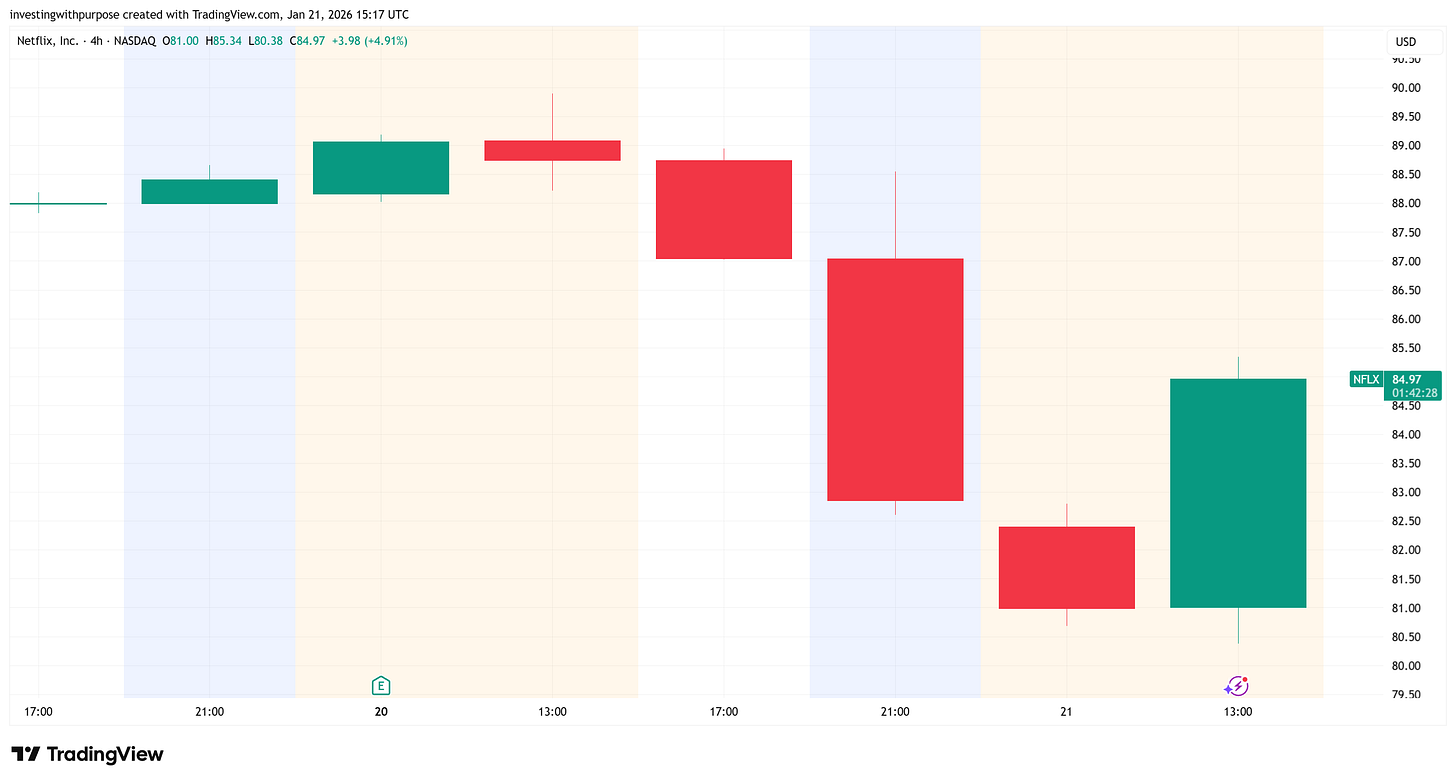 Today’s session matters. After the post-earnings flush, NFLX 0.00%↑ defended the $80–$82 zone during regular trading and printed a strong green daily candle, reclaiming ground lost in the after-hours move.