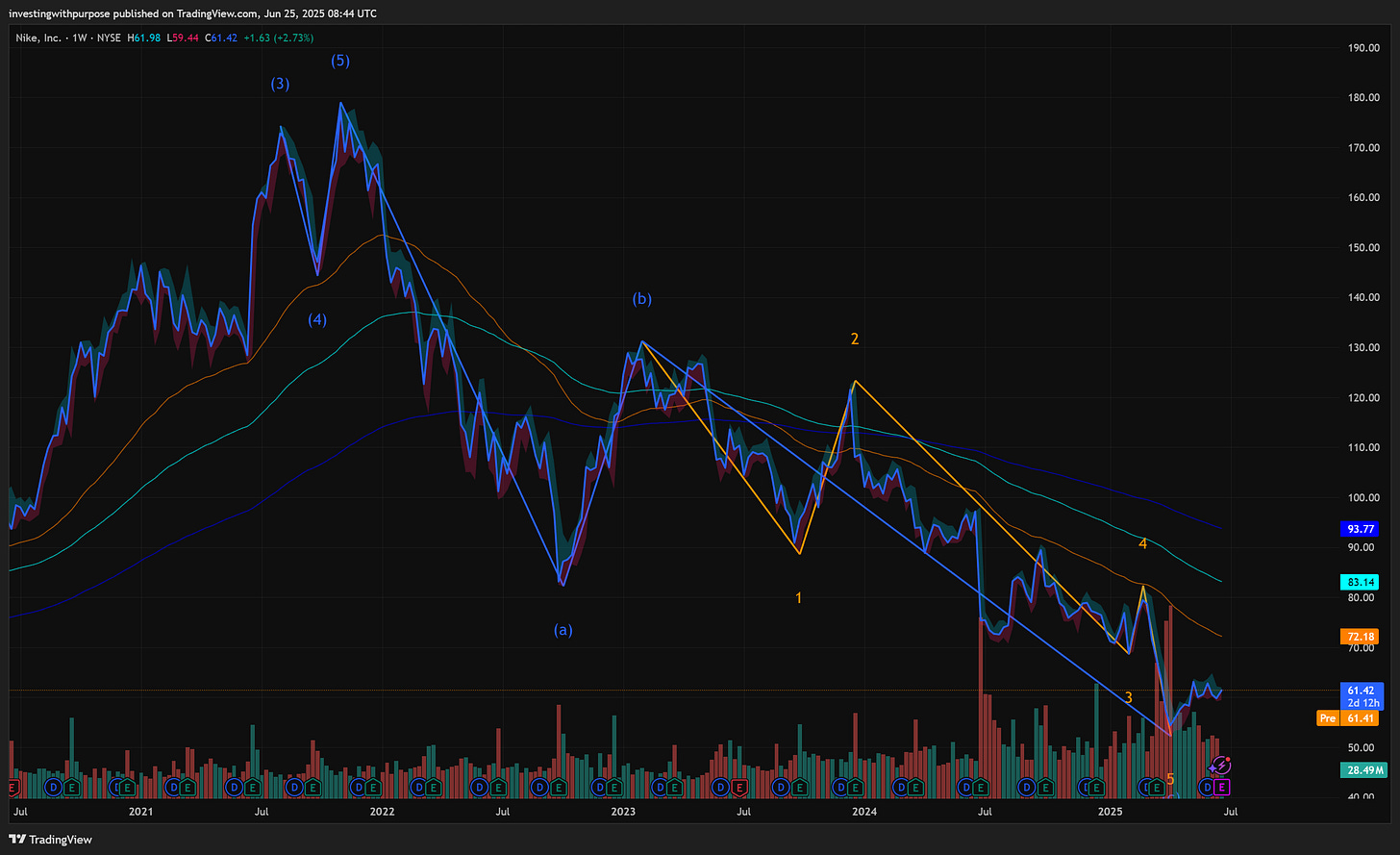NKE 0.00%↑ reports this week. Bounced off 59.19 with a clean MACD cross and rising RSI. But this still looks like a wave (b) relief move inside a larger corrective structure. Big move coming. Earnings will choose the direction.