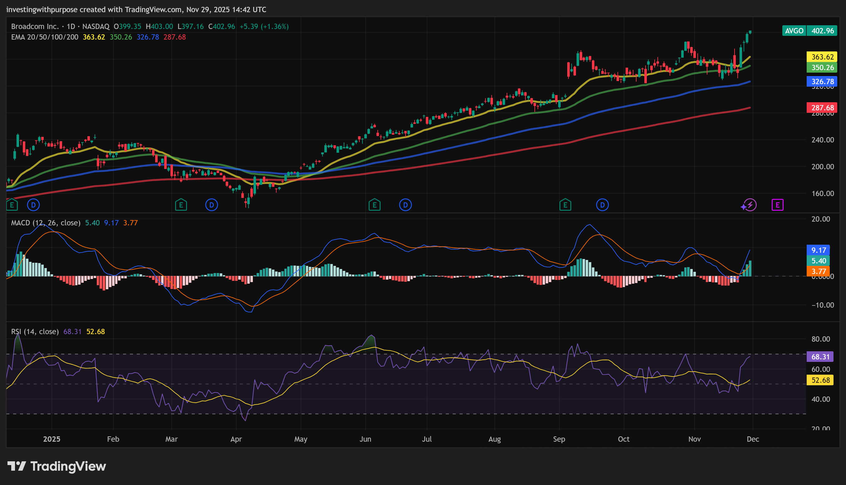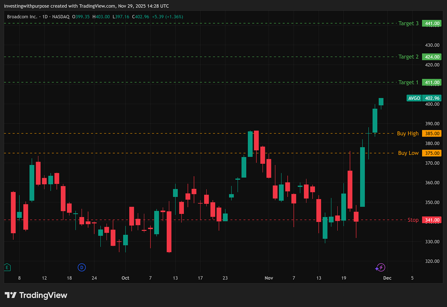 I’d be cautious adding new money to AVGO up here unless you’re very comfortable sitting through a potential 15–25 percent drawdown.
