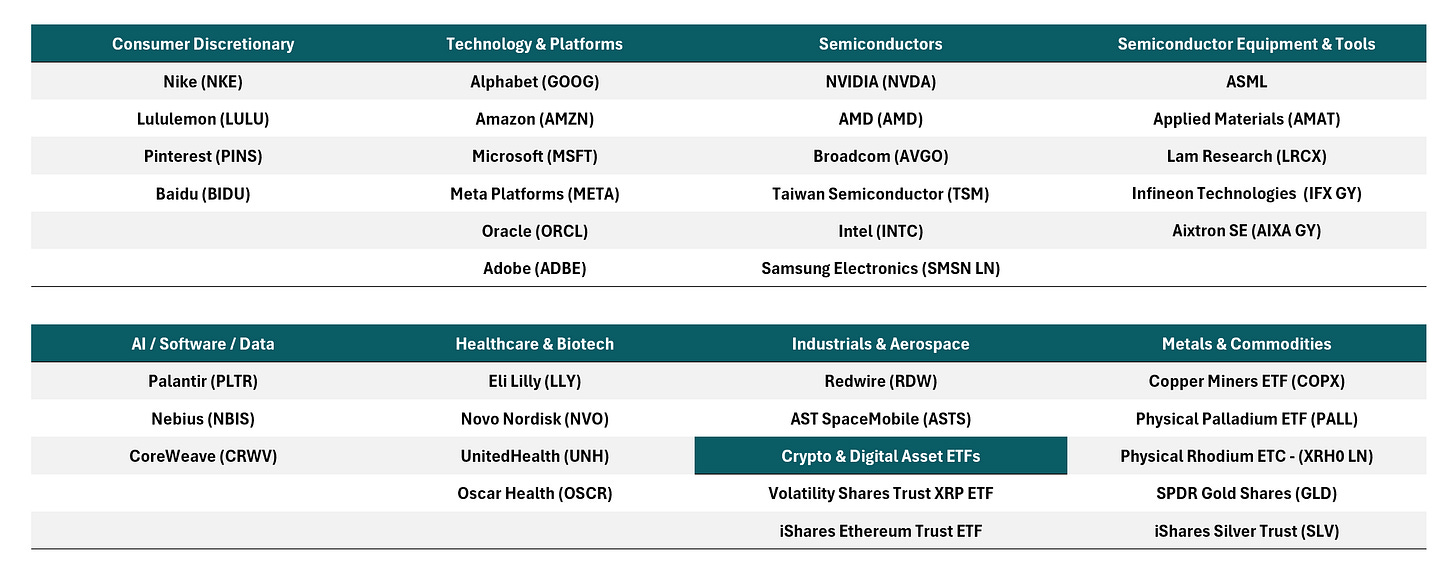This update is built to be trigger-driven. Every ticker has a small set of levels that decide the next swing, with blunt invalidation logic so we do not get emotionally trapped in chop.