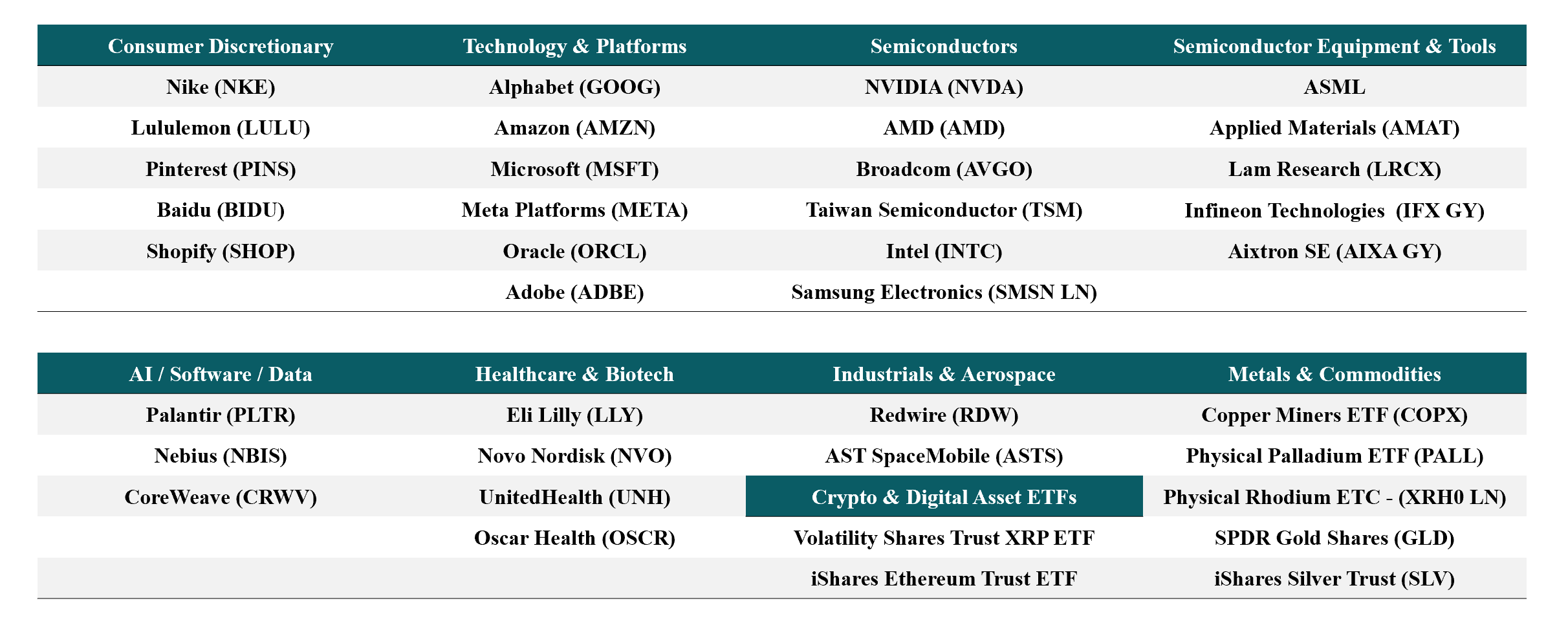 This update covers the following 35+ stocks and ETFs across consumer, technology, healthcare, industrials, and commodities.