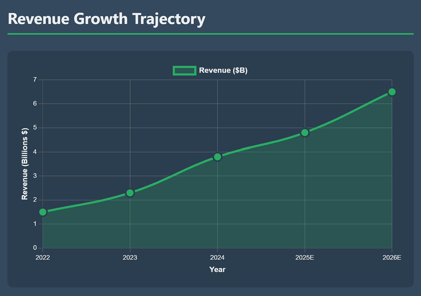 Fundamentals: Revenue +25% YOY to $3.8 B (FY24), 75% gross margins, narrowing operating loss, net loss down ~40%, cash +$3.5B+$3.5 B+$3.5B, zero net debt, positive FCF in FY24. Projections: revenue +35% in FY26, EBITDA margin ~20%.