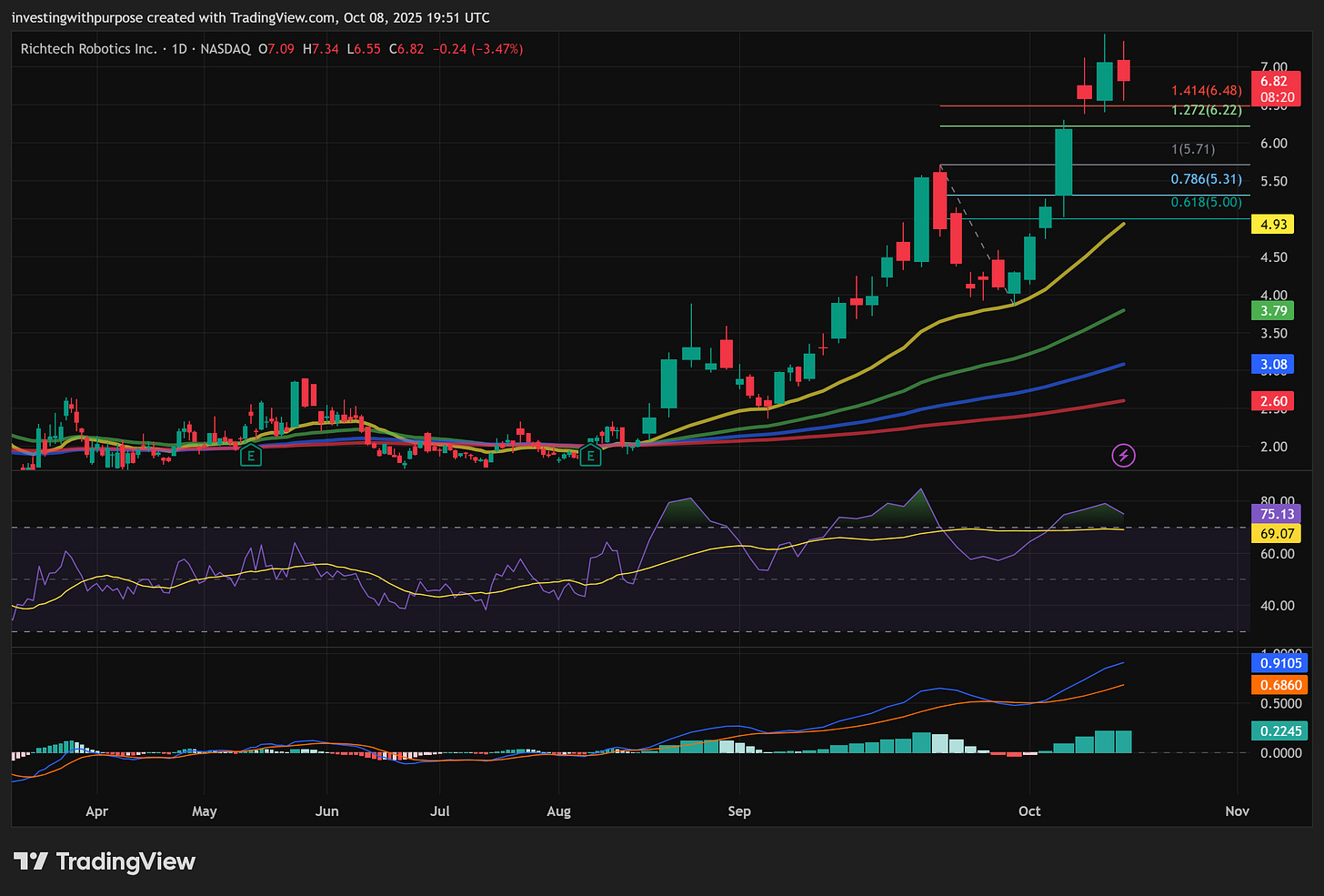 Price stretched above support: Current levels (~6.7) are ~30–40% above the 20-day EMA (~4.9), a technical overextension that often leads to mean reversion.