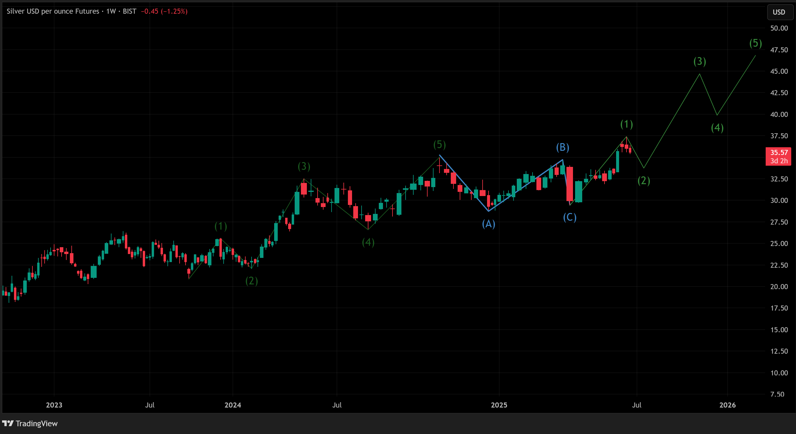 Completed a 5-wave advance into the mid-$38s, now in an A–B–C correction.