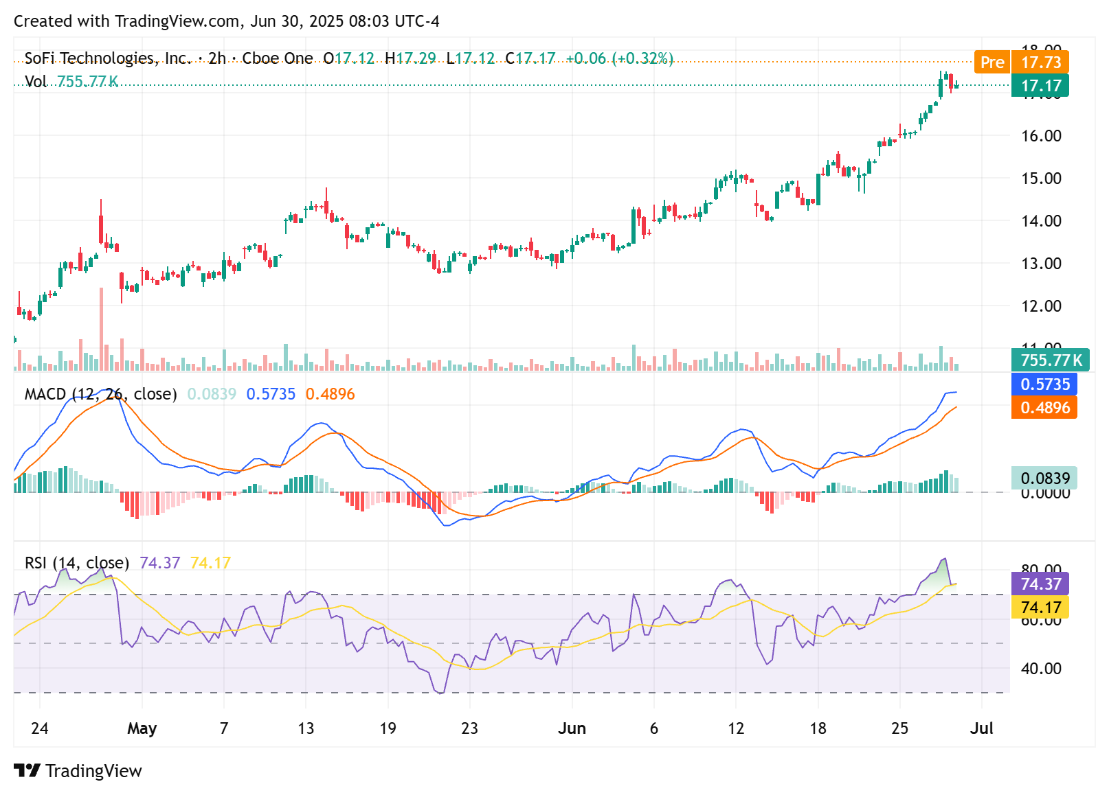 RSI: 74.37, so slightly overbought