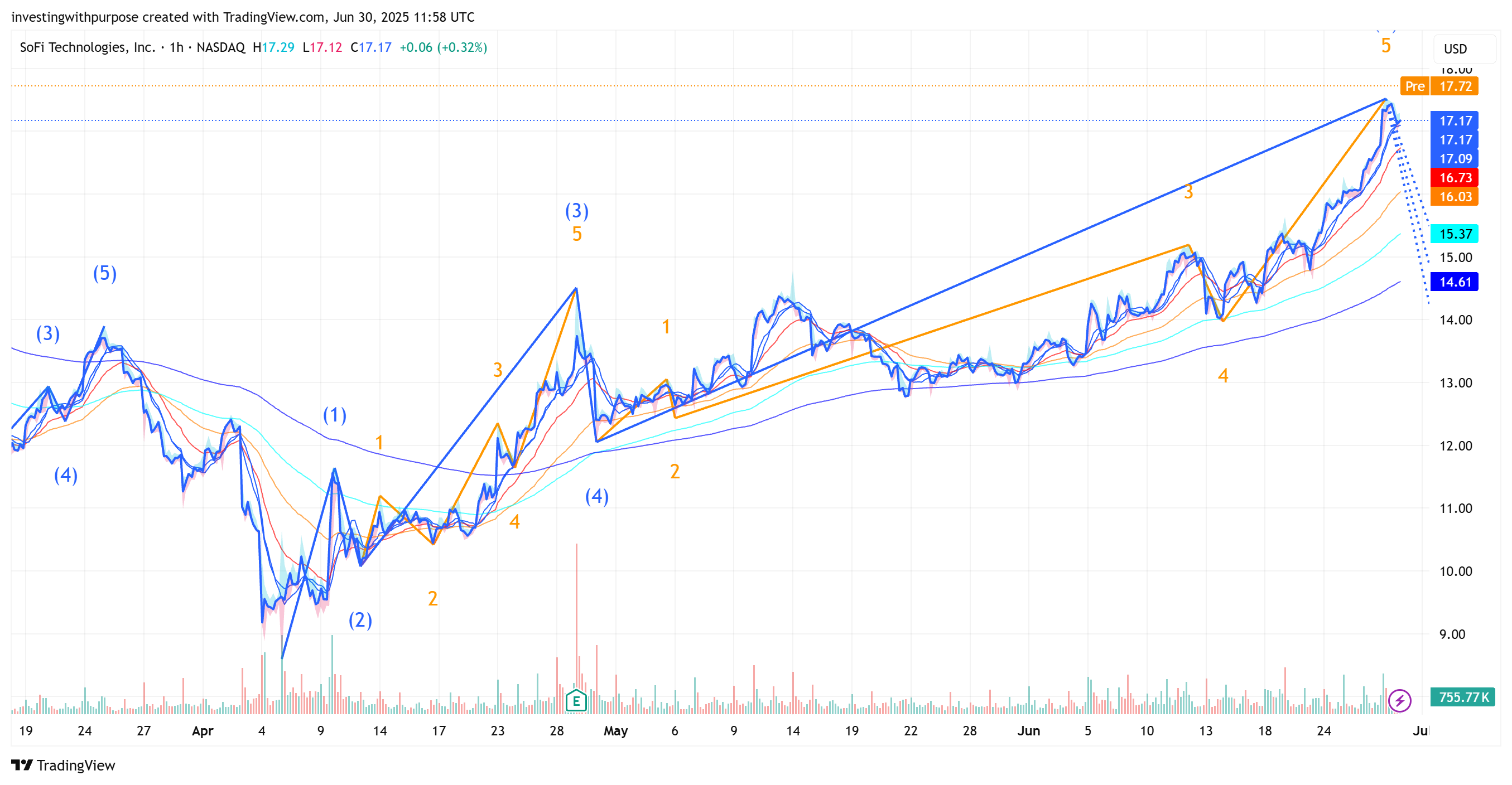 Clear 5-wave advance from April lows (~$7.90) to current ~$17.80.