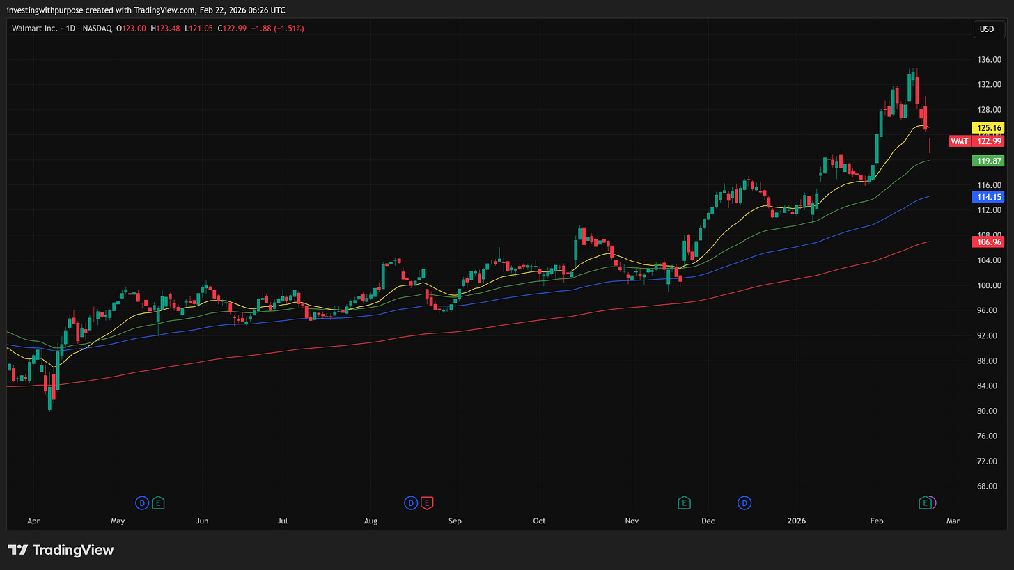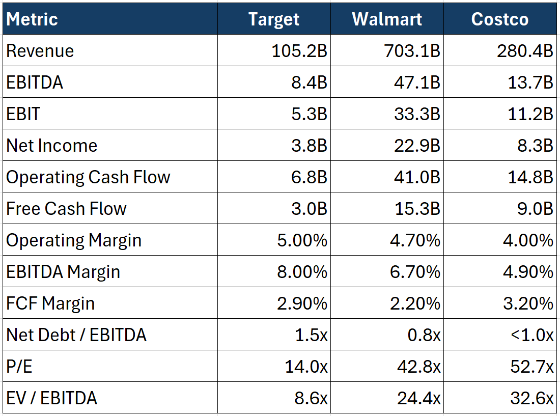 Valuation reflects business quality. Target trades at a discount, Walmart at a premium, Costco at a structural premium.