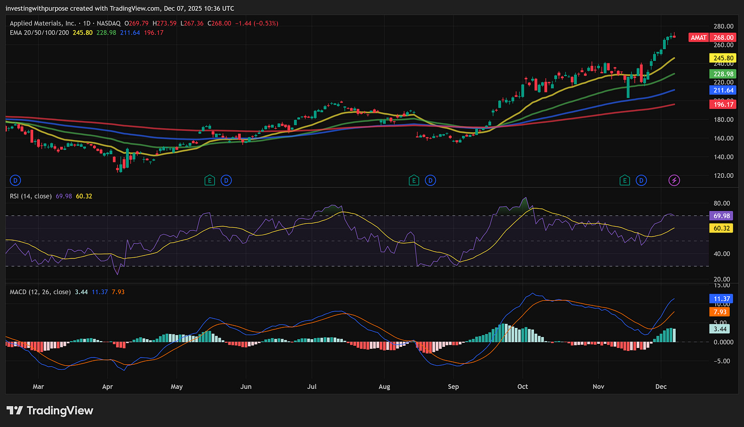 Right now ASML 0.00%↑ trades around $1,100, AMAT 0.00%↑ around $268, and LRCX 0.00%↑ around $159, all near or above prior highs after a powerful run.