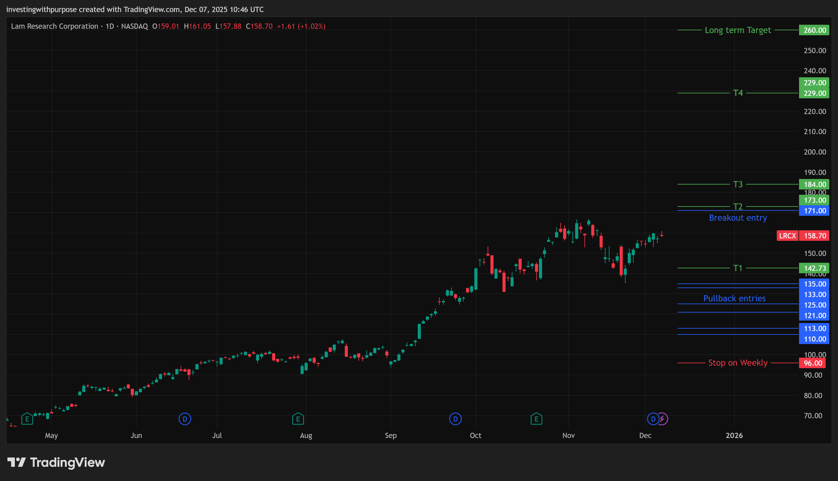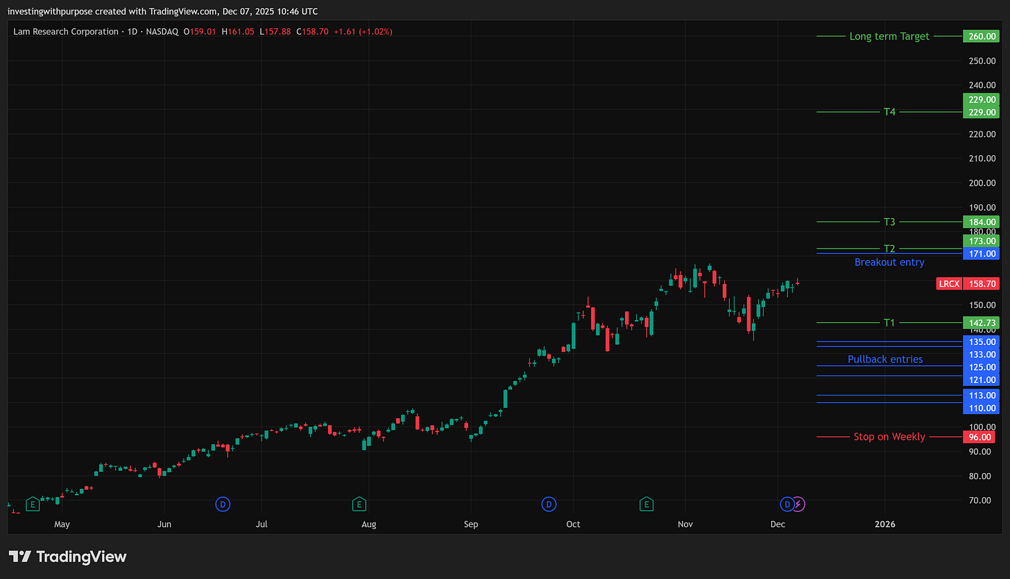 LRCX is the high torque memory lever. You get paid more here when the market panics about DRAM or China and sends price toward the 130s, 120s, or 110s. Until then, patience is a position.