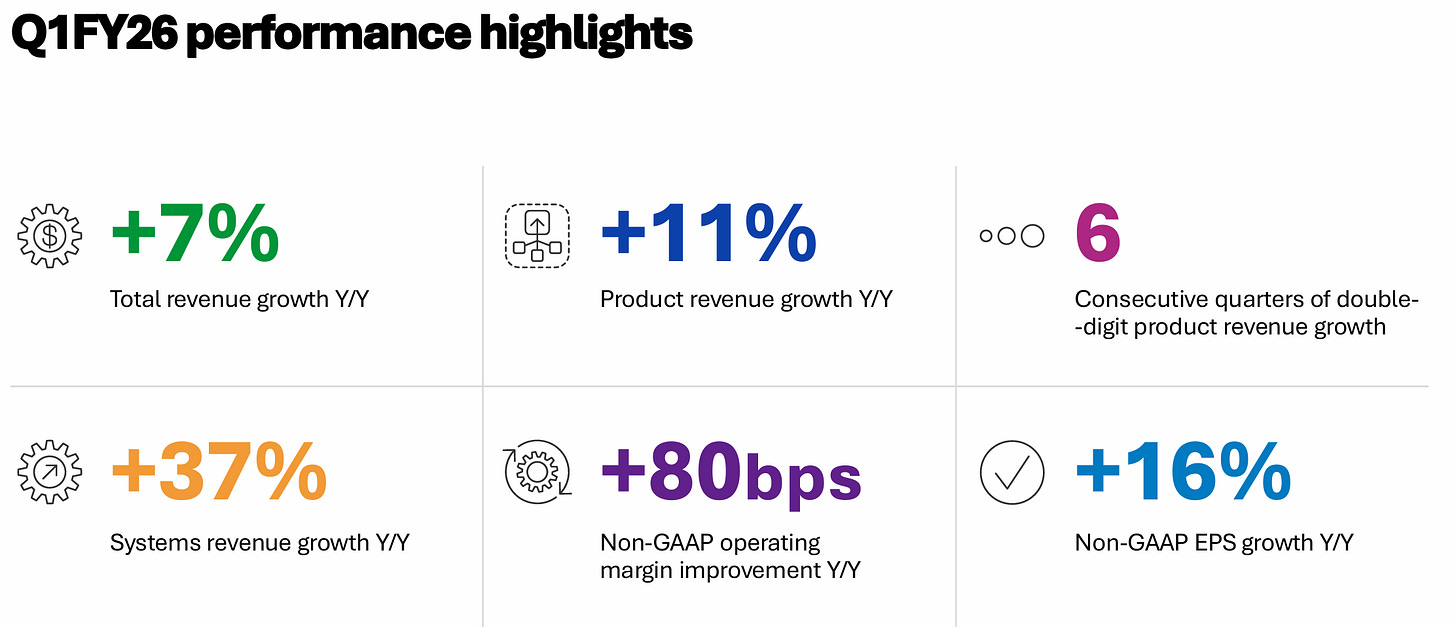 Q1 FY2026 revenue of $822M, up 7% year over year, with non-GAAP EPS of $4.45 up 16% from a year earlier