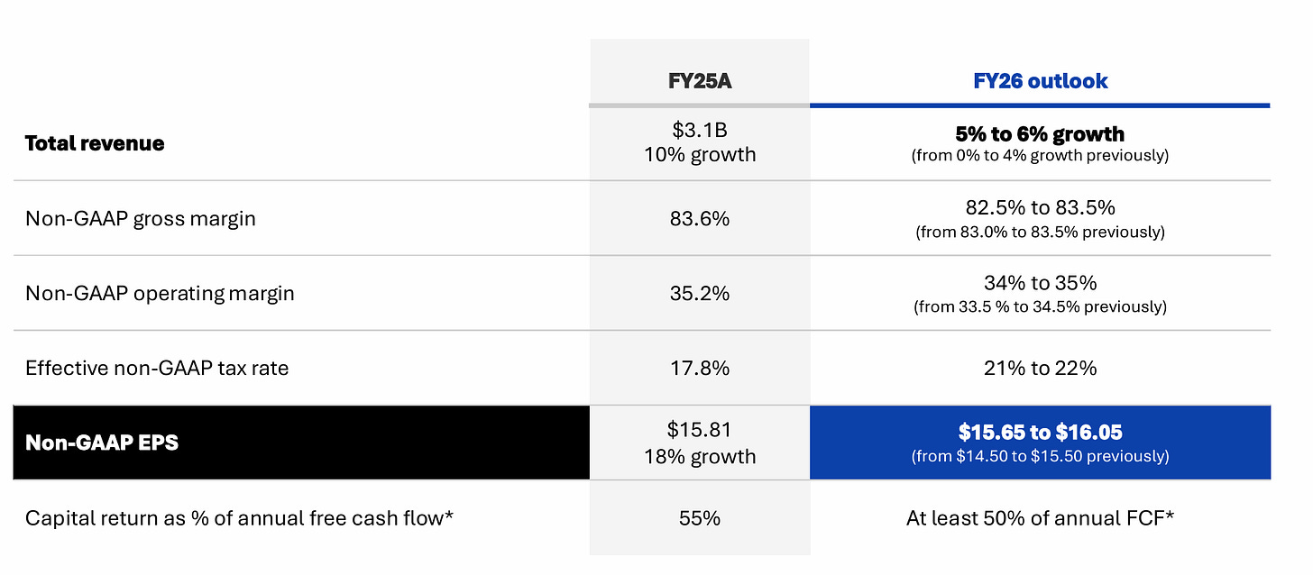 FY26 non-GAAP operating margin guidance: raised to 34–35% (from 33.5–34.5%)
