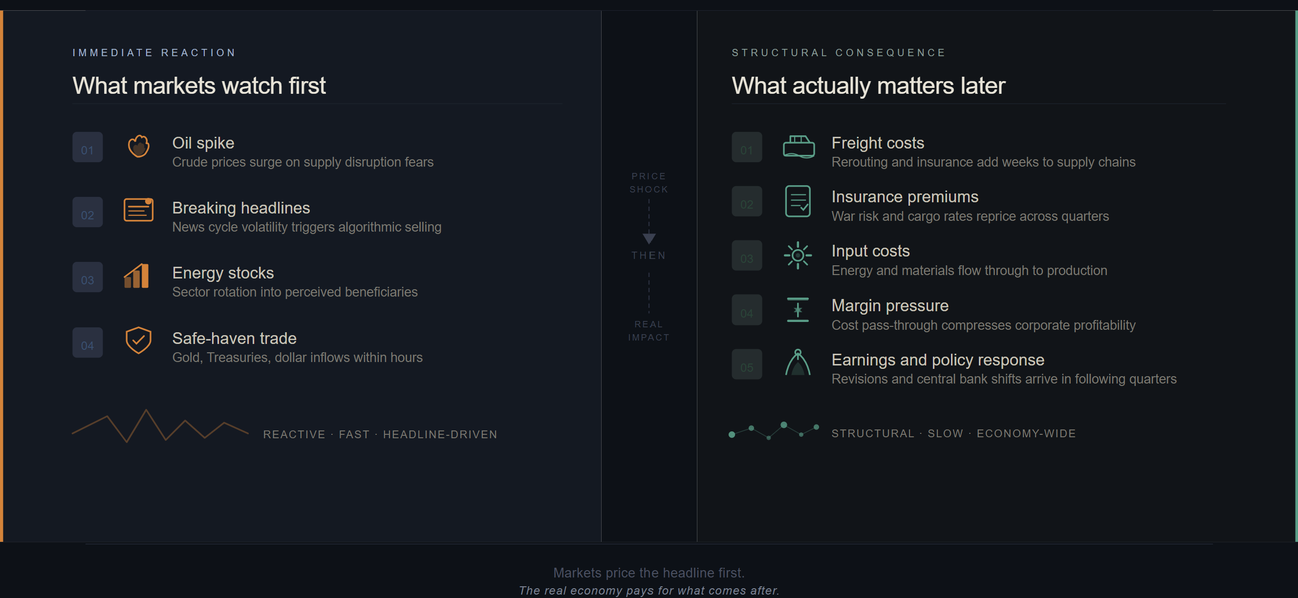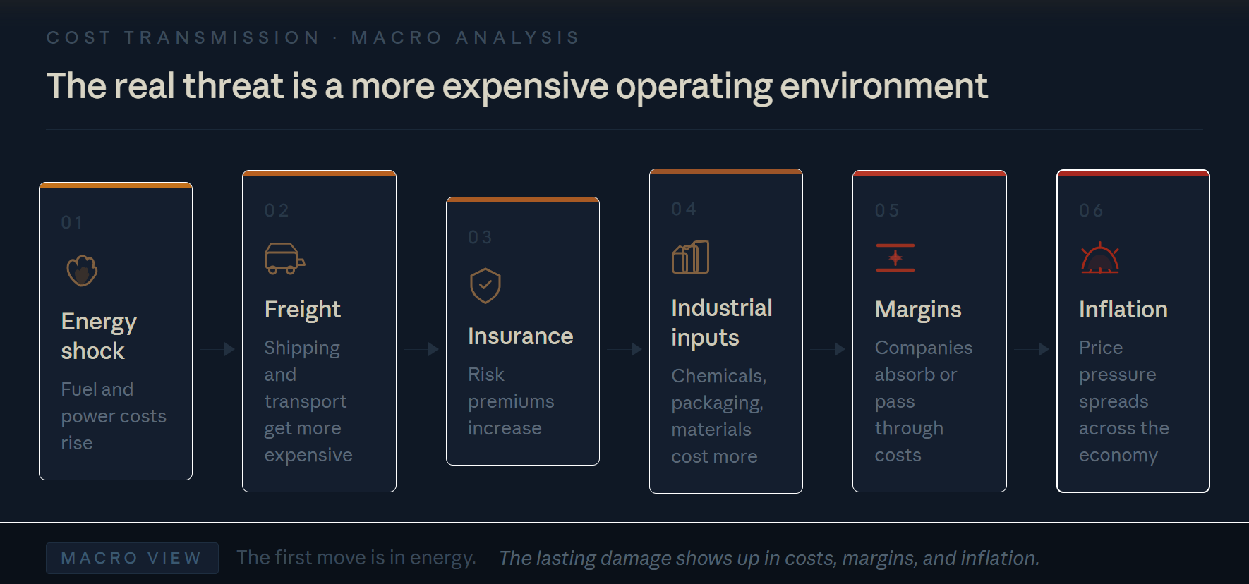 Third, the real danger is not the visible spike. It is the slower reset in freight, inputs, margins, and inflation expectations that follows.