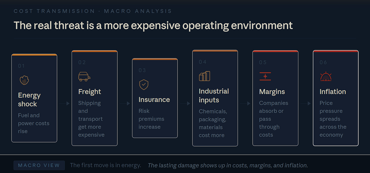 This is the part many investors underestimate. Higher oil prices matter, but higher fuel prices alone do not explain the full risk. Energy sits underneath transport, chemicals, fertilizers, plastics, packaging, industrial heat, manufacturing, and food production. Once supply is disrupted, businesses do not just face one higher cost. They start paying more across several lines at once.