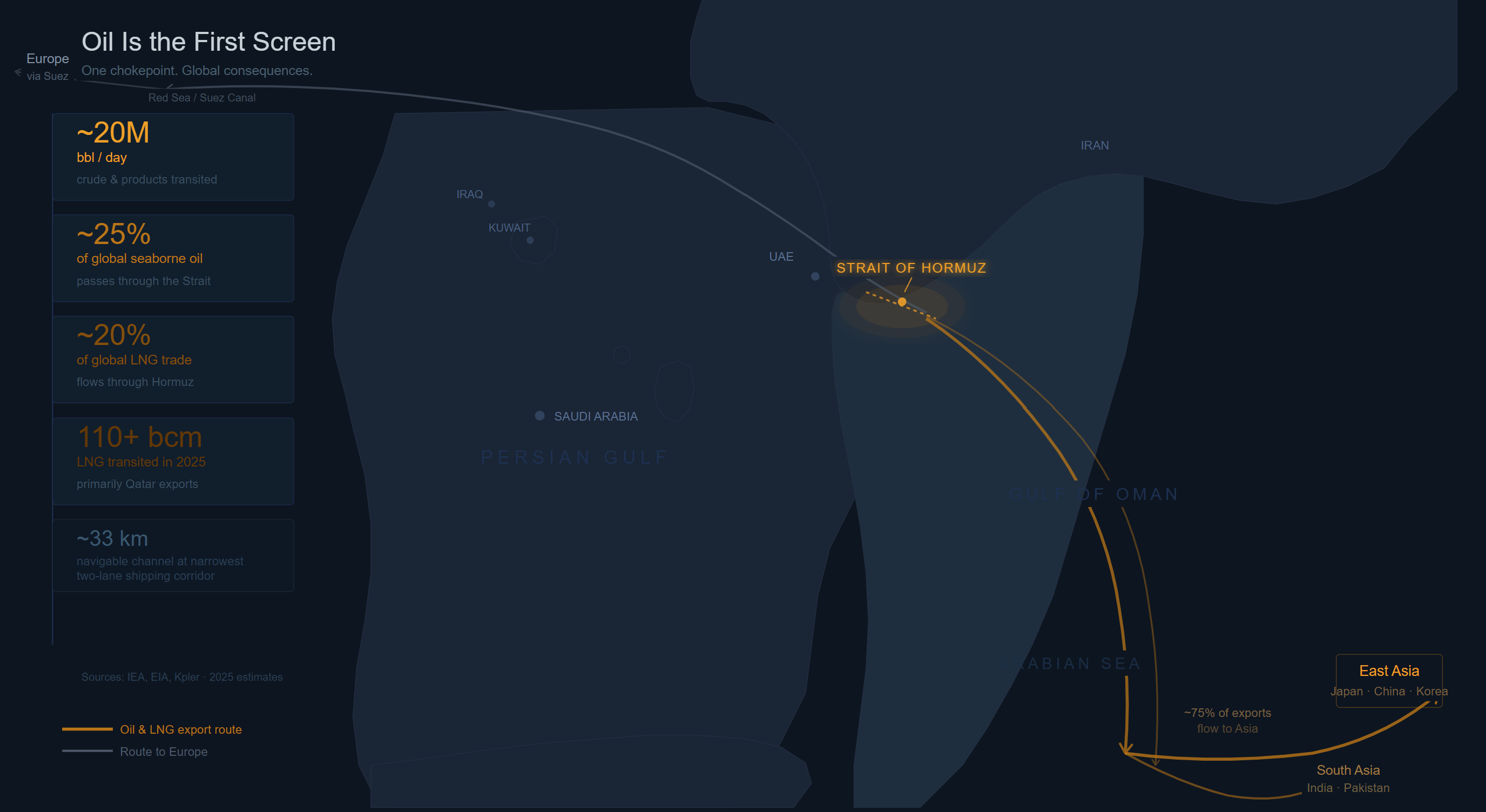 The Gulf matters because it is not just a source of oil. It is one of the main arteries through which oil, gas, and industrial feedstocks move into the global economy. That means disruption in the region does not remain a local problem for very long. It travels outward through trade routes, shipping costs, energy markets, and production chains.
