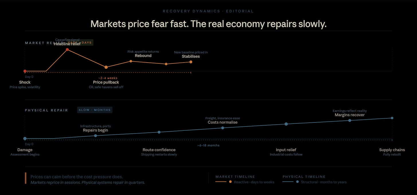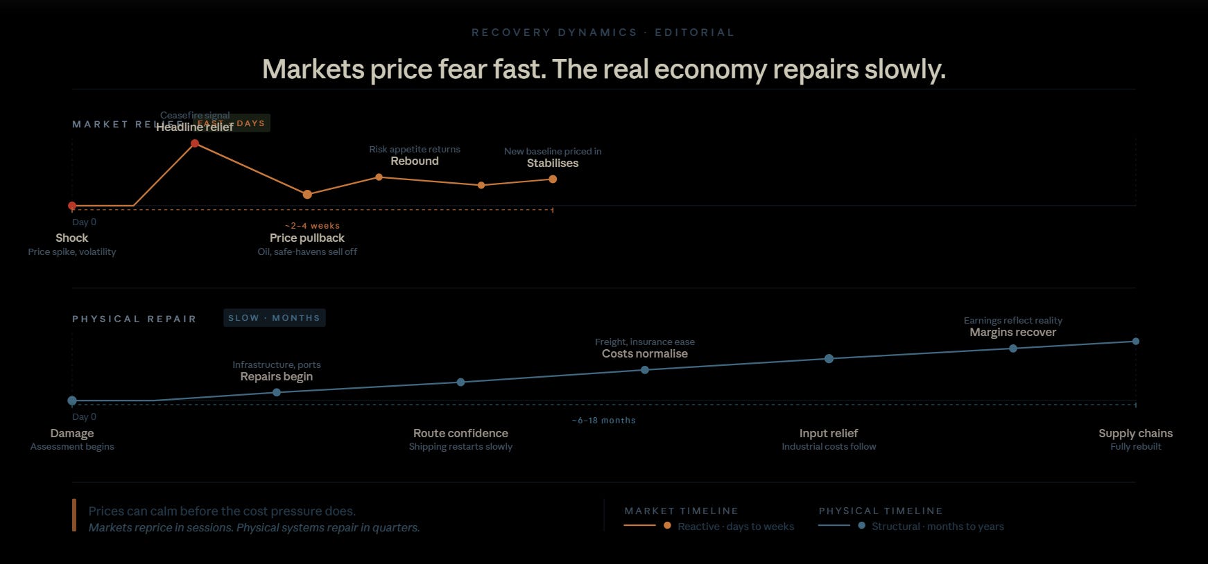Second, market relief and supply-chain repair are not the same thing. Prices can calm down before the damage is fully absorbed.