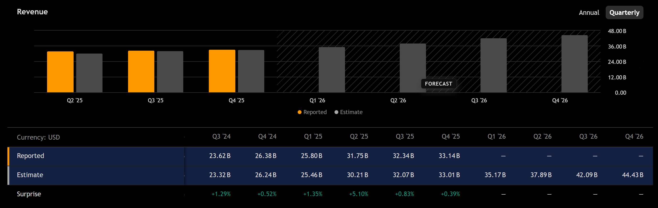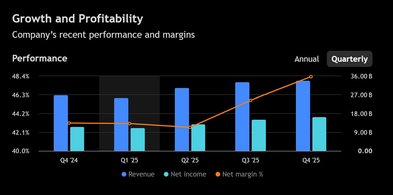 Revenue growth is re-accelerating after a cyclical trough. Year-over-year growth has turned positive and is trending toward low double digits. If AI demand sustains, that trajectory could expand further.