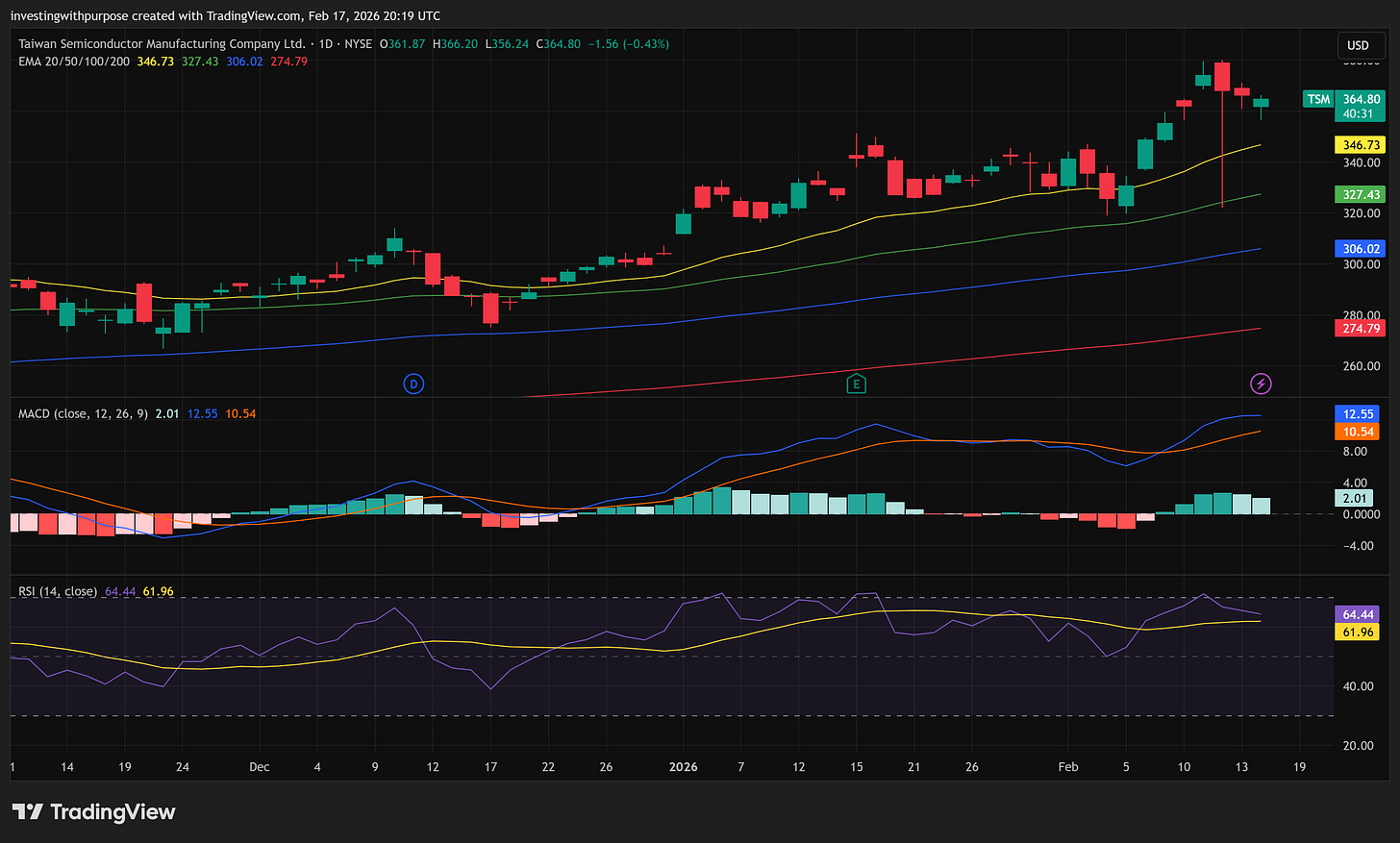 TSM is no longer emerging from consolidation. It is extended, trending, and attracting attention. That changes positioning risk and opportunity simultaneously.
