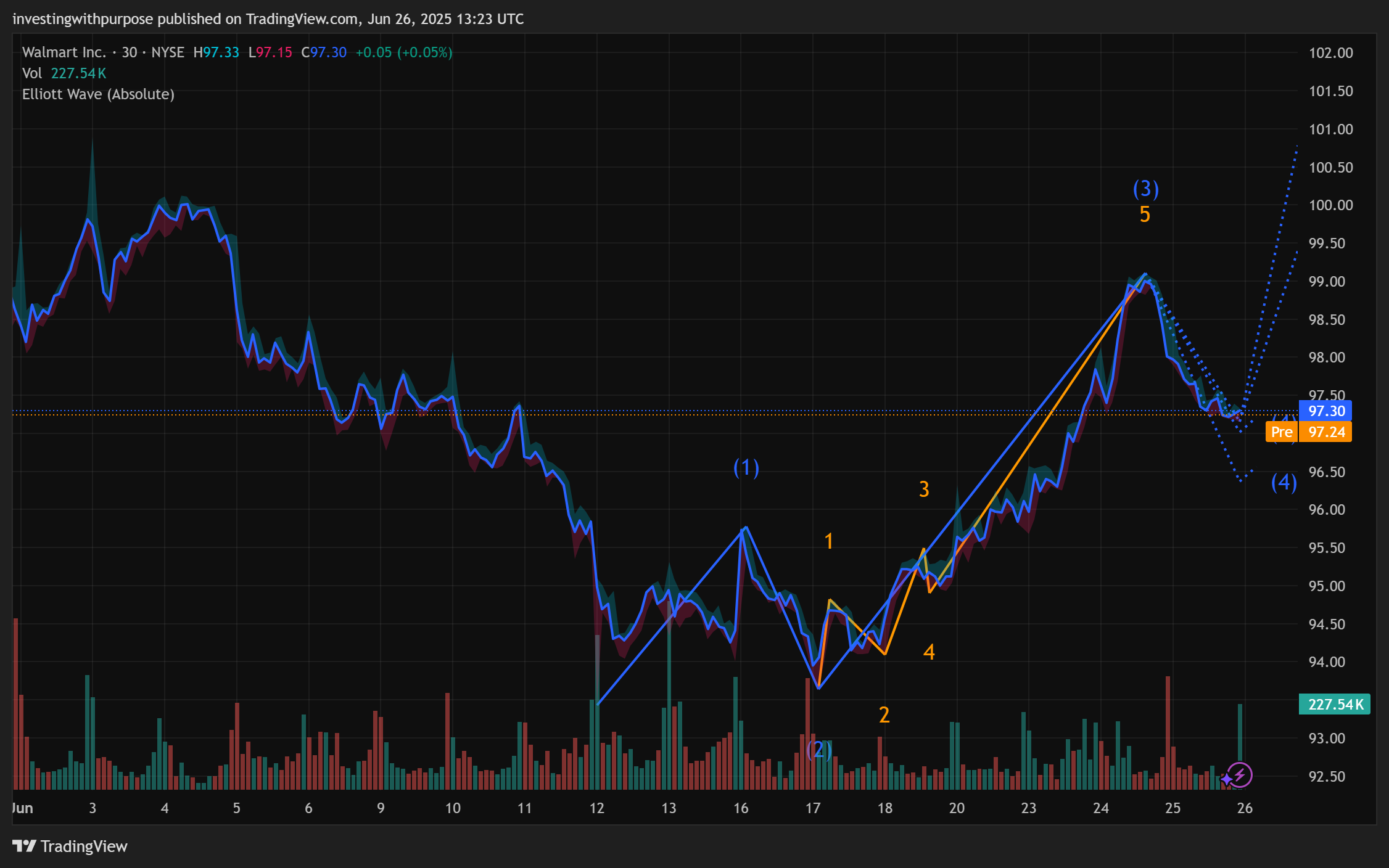 Walmart is at the tail end of its Wave 3 trend, having just completed the fifth leg of its sub-wave. As a result, the stock is retracing within Wave 4, presenting a potential entry before higher targets.
