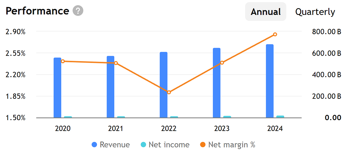 Growth Outlook: ~5% Revenue growth projected, with EPS growth forecast around or even above 10% for the next year, making Walmart a stable long‑term compounder. Higher earnings this year would drive trailing P/E closer to forward.