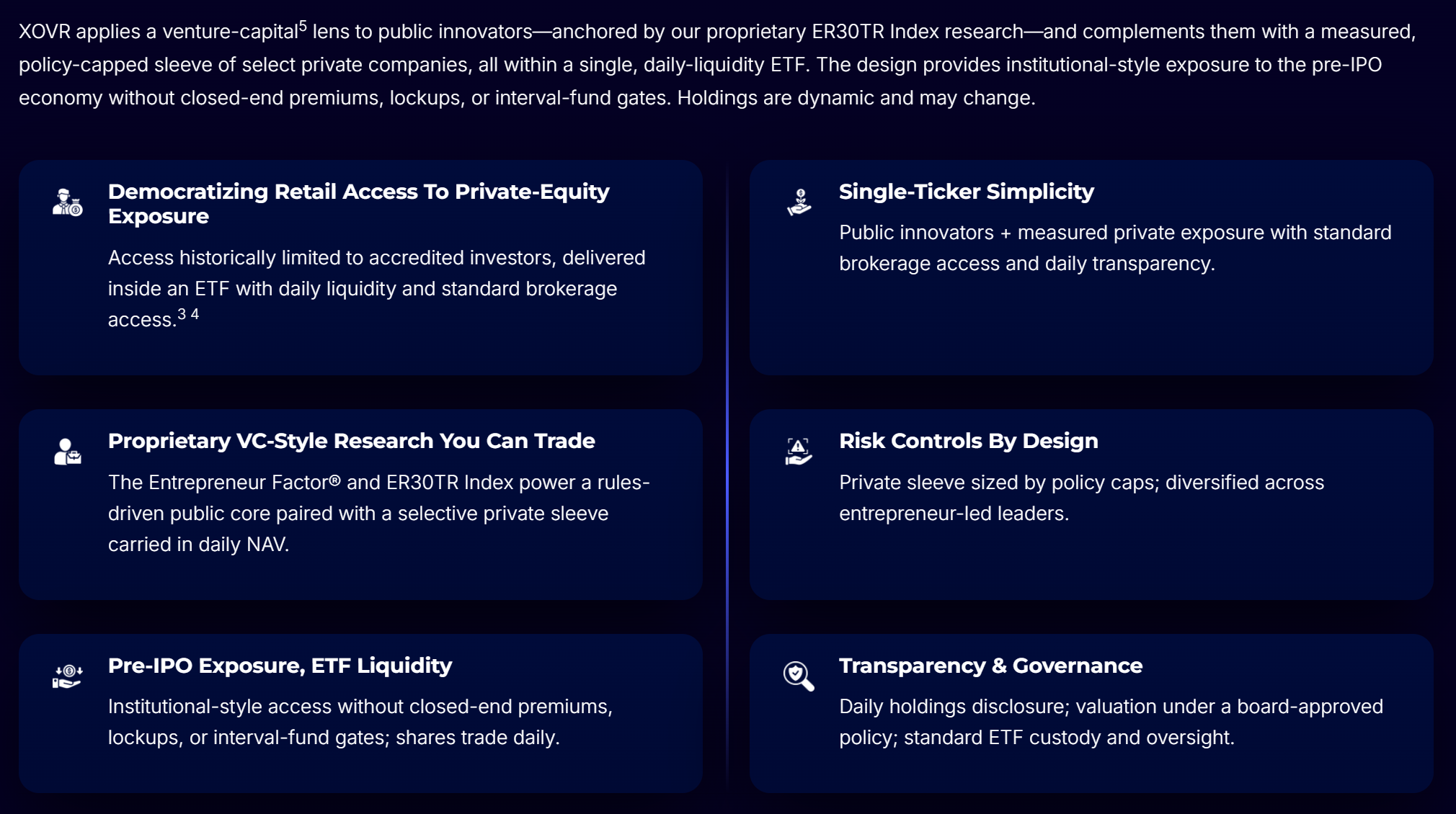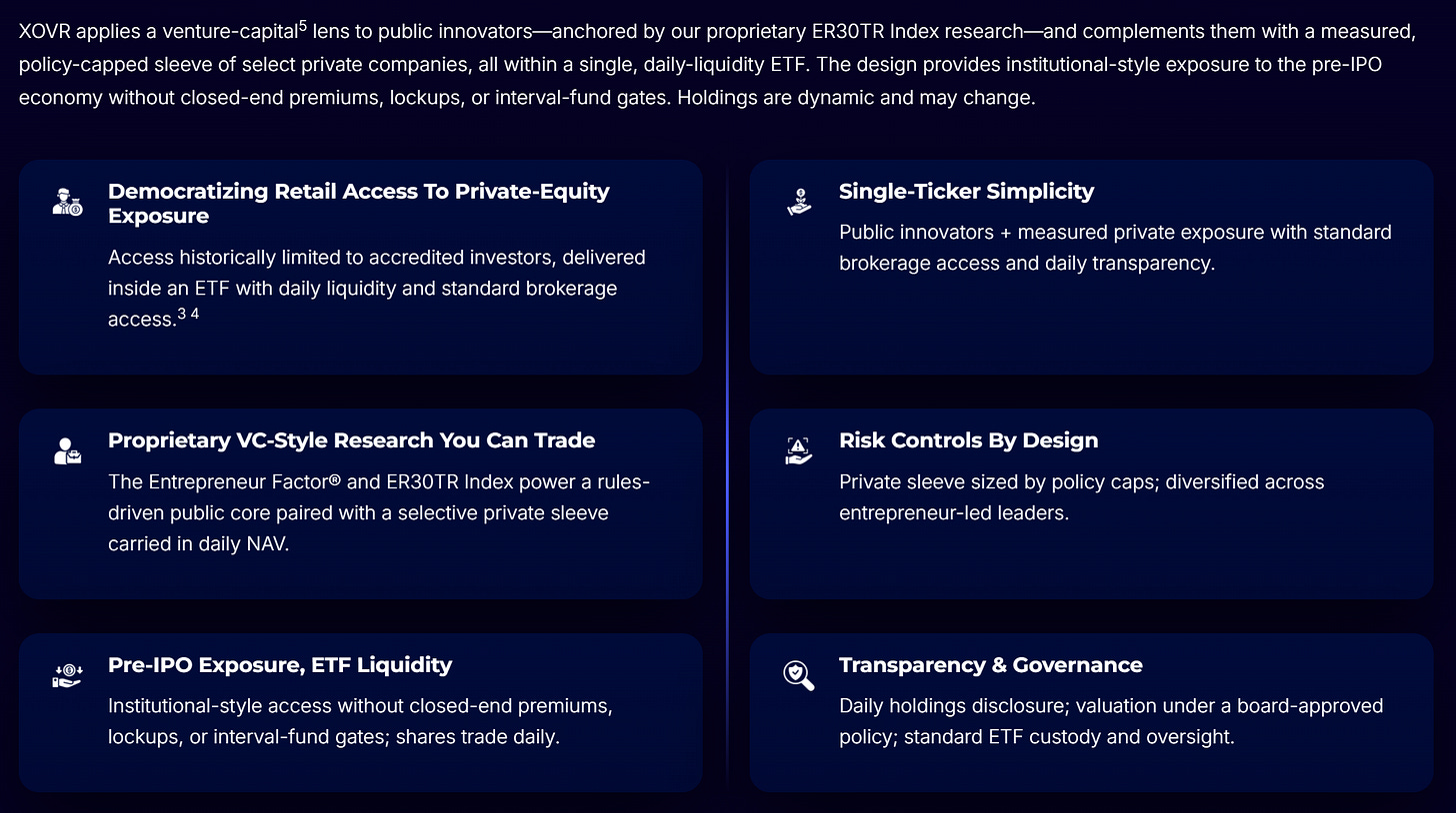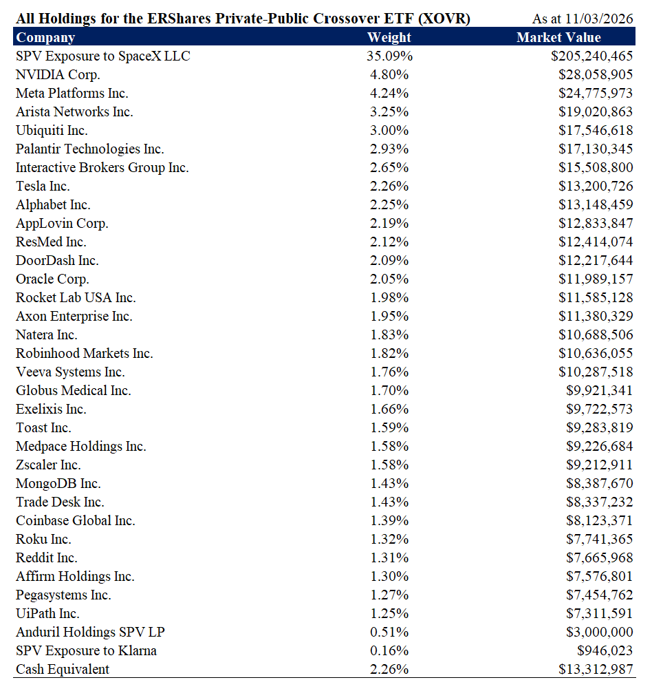The vehicle is the ERShares Private‑Public Crossover ETF, trading under the ticker XOVR.