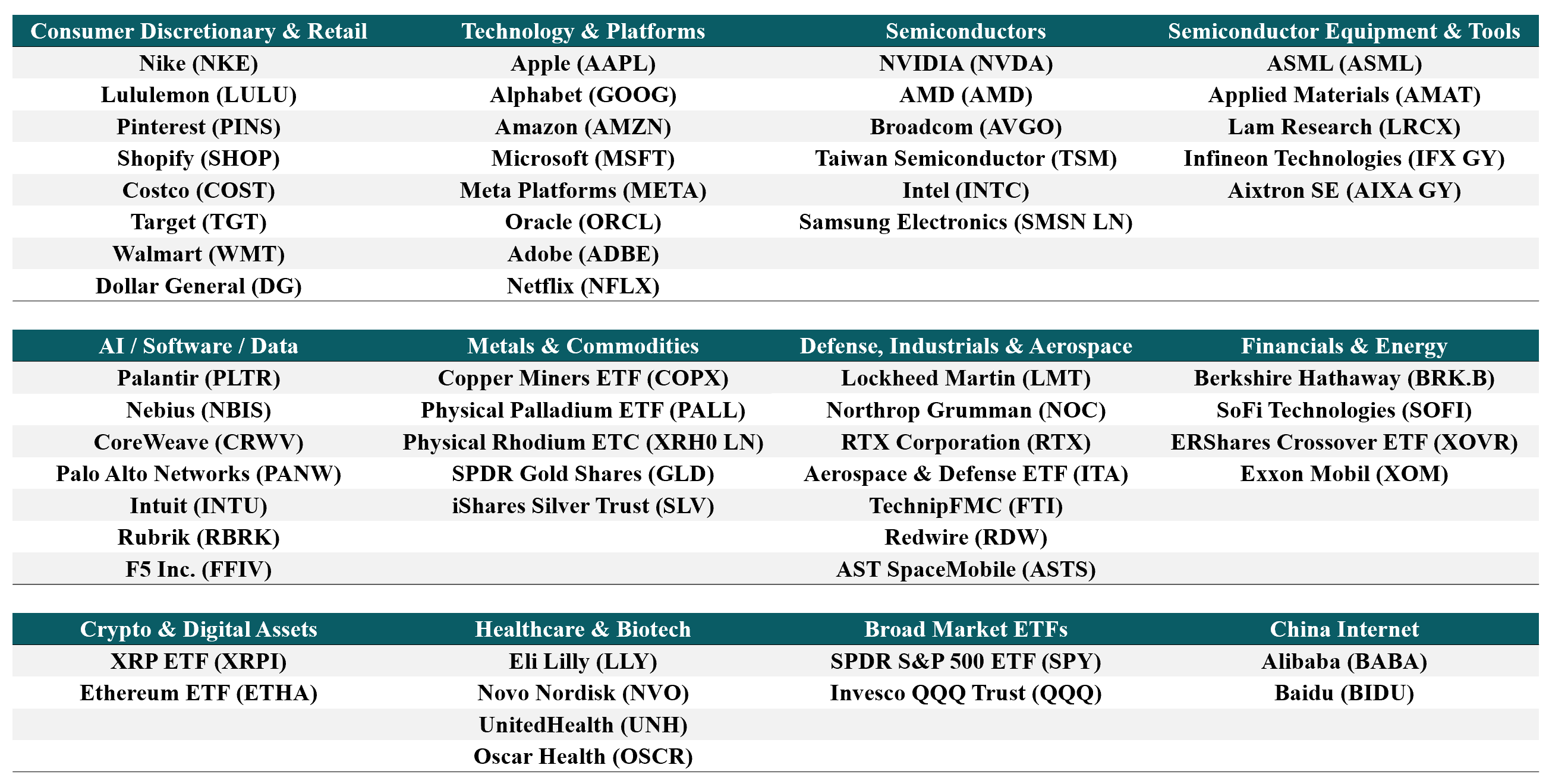 This update covers the following 60 stocks and ETFs across semiconductor equipment, mega-cap technology, enterprise software, Chinese internet, consumer defensive and value retail, aerospace and defense, European industrials, precious metals, digital assets, healthcare, fintech, cybersecurity, commodities, and broad market indices: